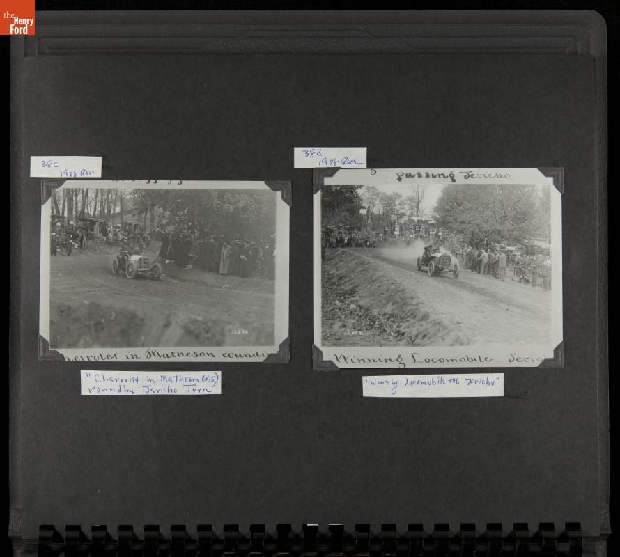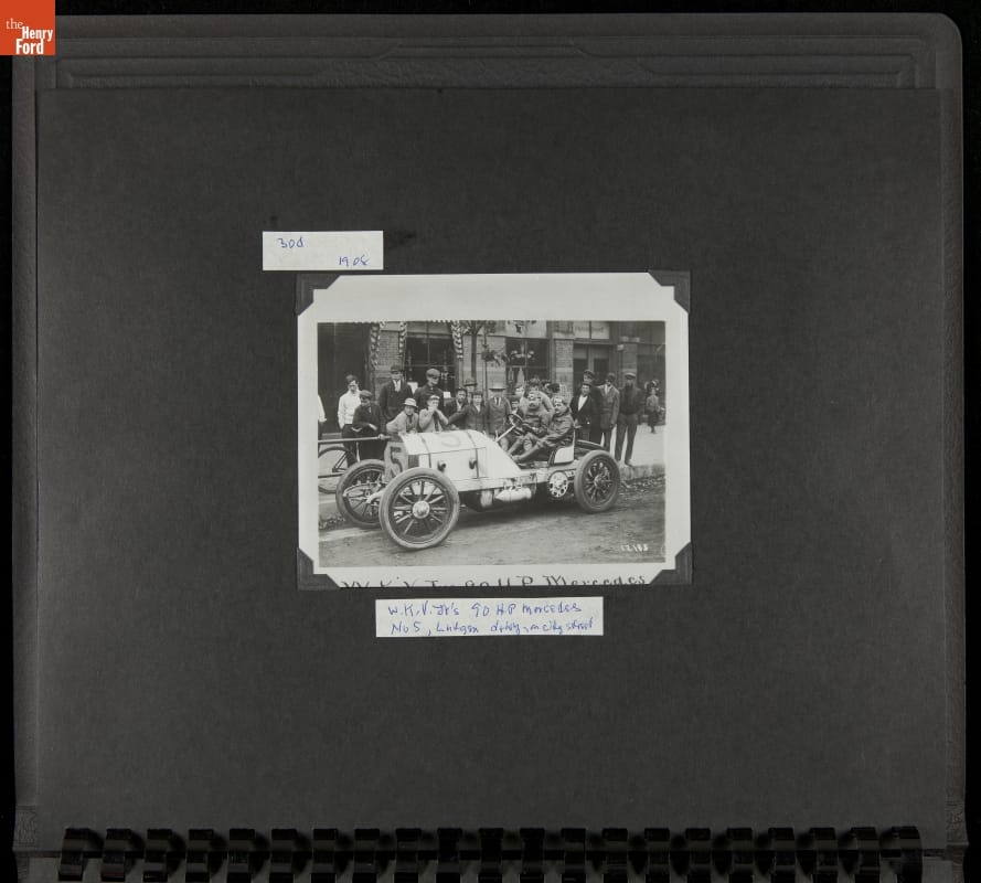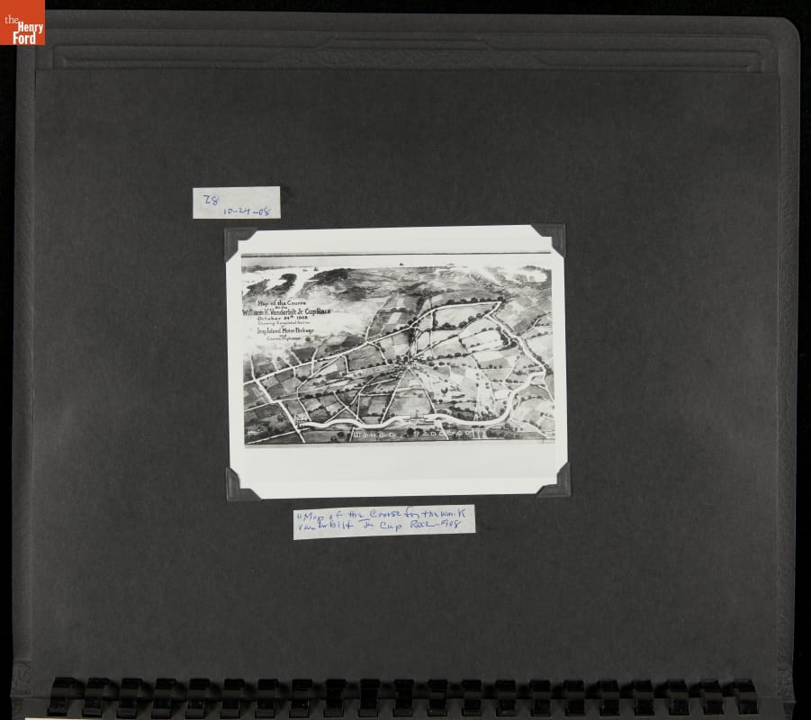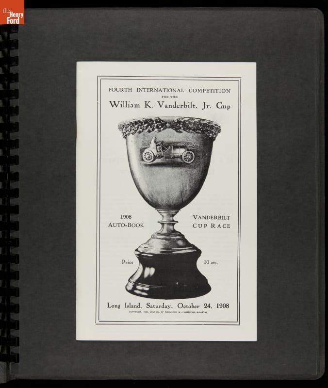 The Vanderbilt Cup, held on New York's Long Island from 1904 to 1910, was America's first internationally prominent automobile race. William K. Vanderbilt, Jr., a wealthy railroad heir, organized the competition over public roads. This photo album documents the 1908 race, won by American driver George Robertson in a Locomobile. It was the first Vanderbilt Cup victory for an American-built car.