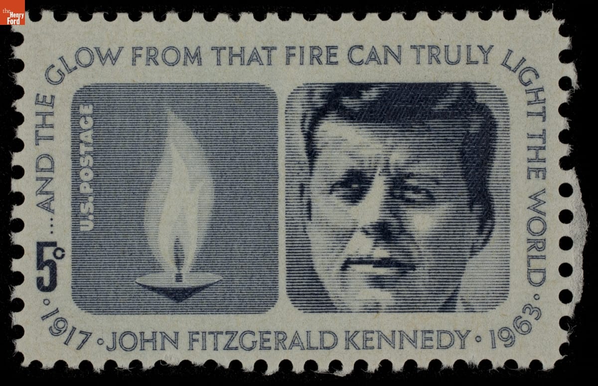 Text on front: 1917 JOHN FITZGERALD KENNEDY 1963 / 5¢ / ...AND THE GLOW FROM THAT FIRE CAN TRULY LIGHT THE WORLD / U.S. POSTAGE