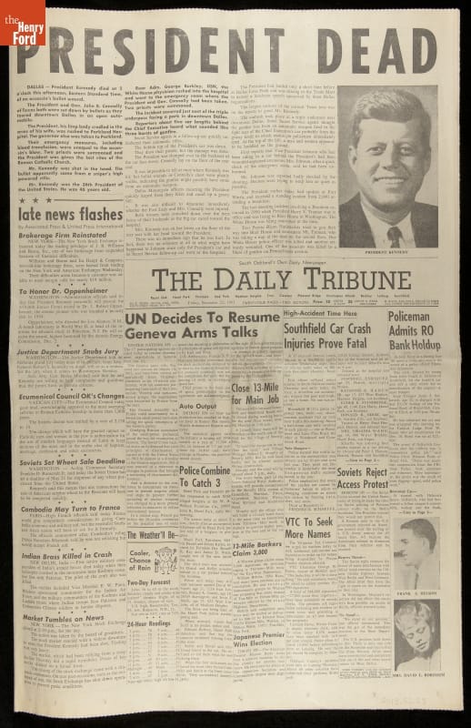 This Friday evening issue of the Royal Oak, Michigan, Daily Tribune from the day of President John F. Kennedy's death, November 22, 1963, shows the way newspapers around the world announced the tragedy. The editors added the late-breaking news of the events in Dallas as a headline and story to the already prepared front page. This lengthy coverage was only for such major events.