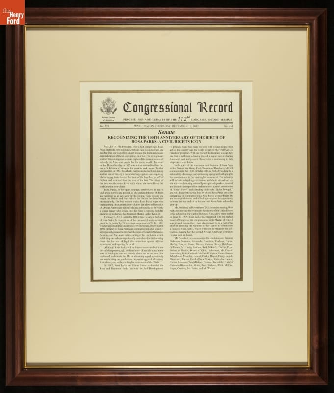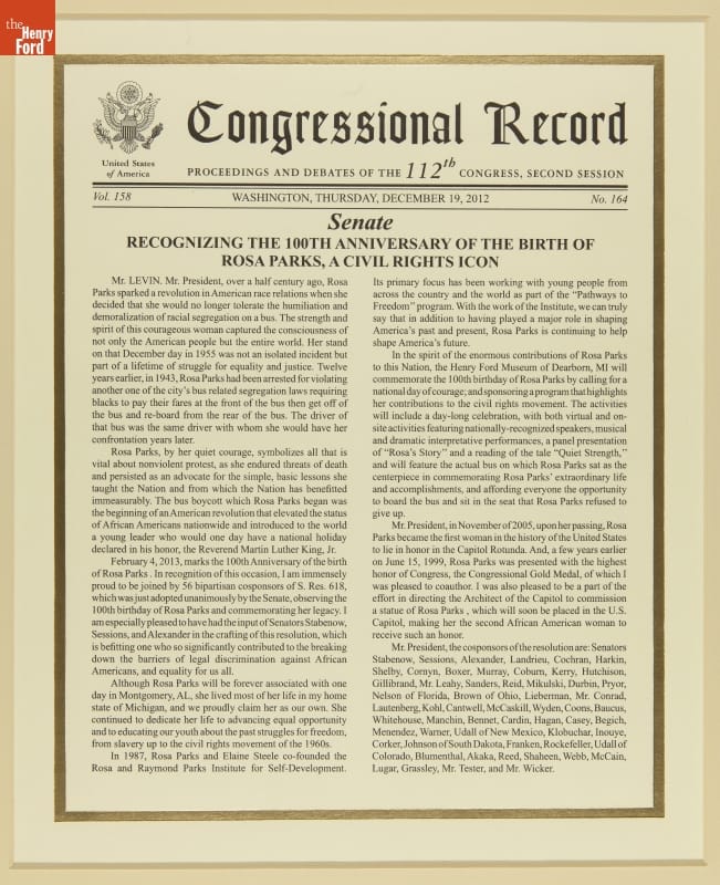United States Senate Resolution Recognizing the 100th Anniversary of the Birth of Rosa Parks, December 19, 2012 (Page 1 of 3)