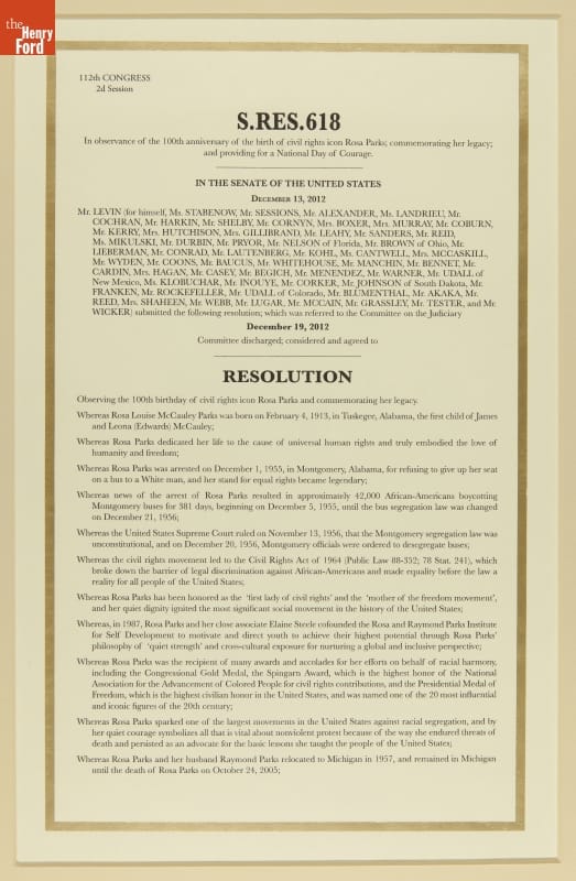 United States Senate Resolution Recognizing the 100th Anniversary of the Birth of Rosa Parks, December 19, 2012 (Page 2 of 3)