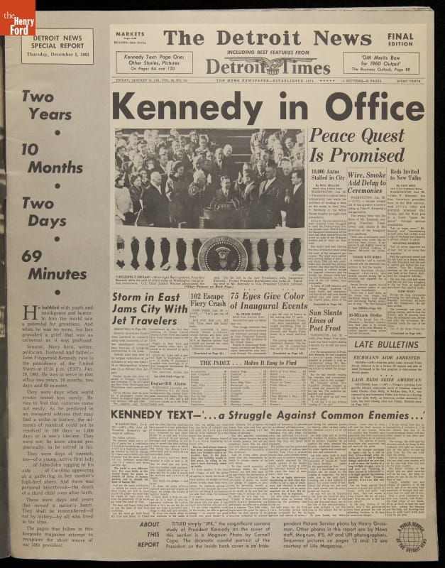 This Thursday evening issue of the Detroit News almost two weeks after President John F. Kennedy's death shows the way newspapers continued to report news of his assassination. The editors took the unusual step of devoting an entire section to a remembrance of his presidency with a photo cover and title inside, "Two Years, 10 Months, Two Days, 69 Minutes."
