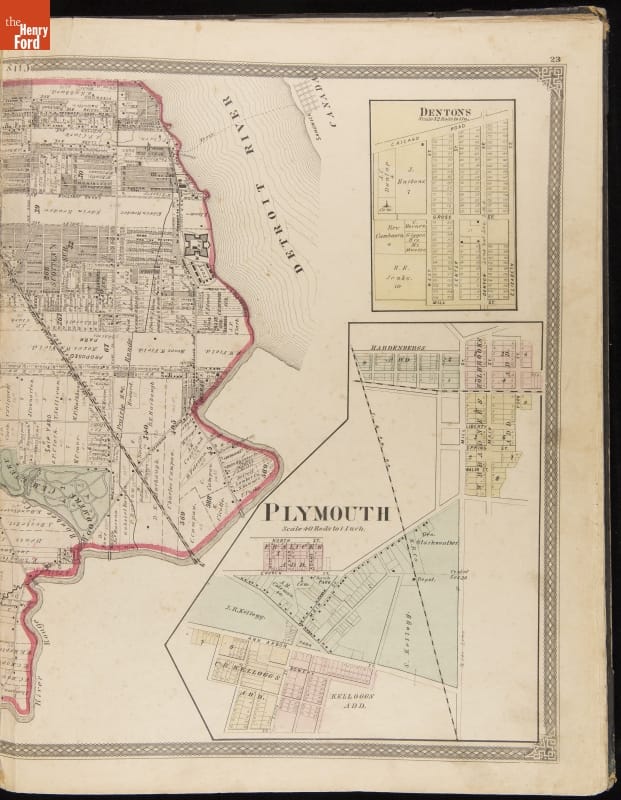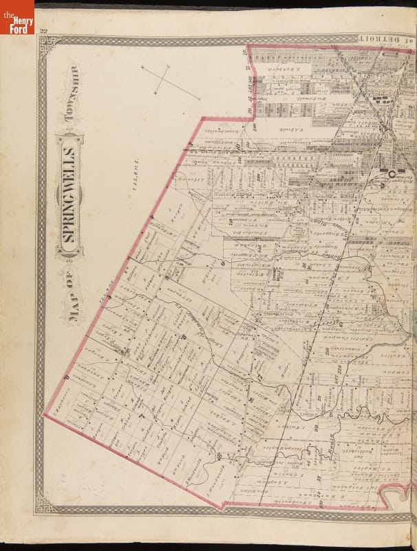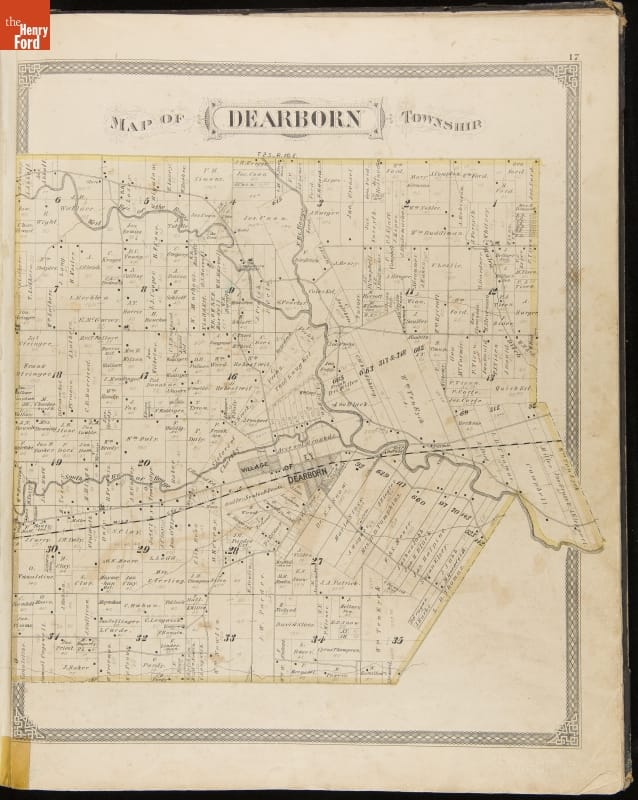 In the 19th century, publishers produced atlases for counties all over the United States. One of the illustrations in this atlas is an aerial view of the William Ford Farm in Springwells Township -- now Dearborn, Michigan. Industrialist Henry Ford, William and Mary Ford's eldest son, was born in the farmhouse on July 30, 1863, and he grew up on this farm.