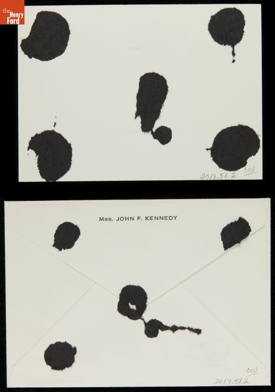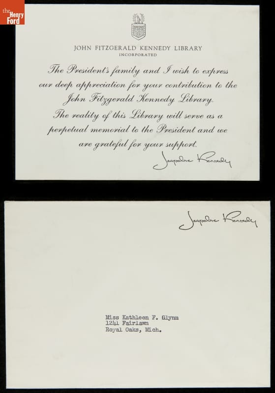 Soon after President Kennedy's death, Jacqueline Kennedy began work on creating the John F. Kennedy Library as a memorial to her husband. Mrs. Kennedy chose then relatively unknown architect I. M. Pei to design the building (completed in 1979). This card, with the printed signature of Jacqueline Kennedy, thanks the sender for a contribution to the John Fitzgerald Kennedy Library fund.