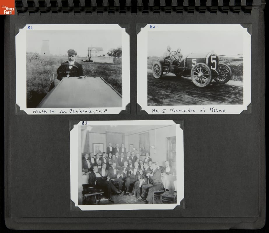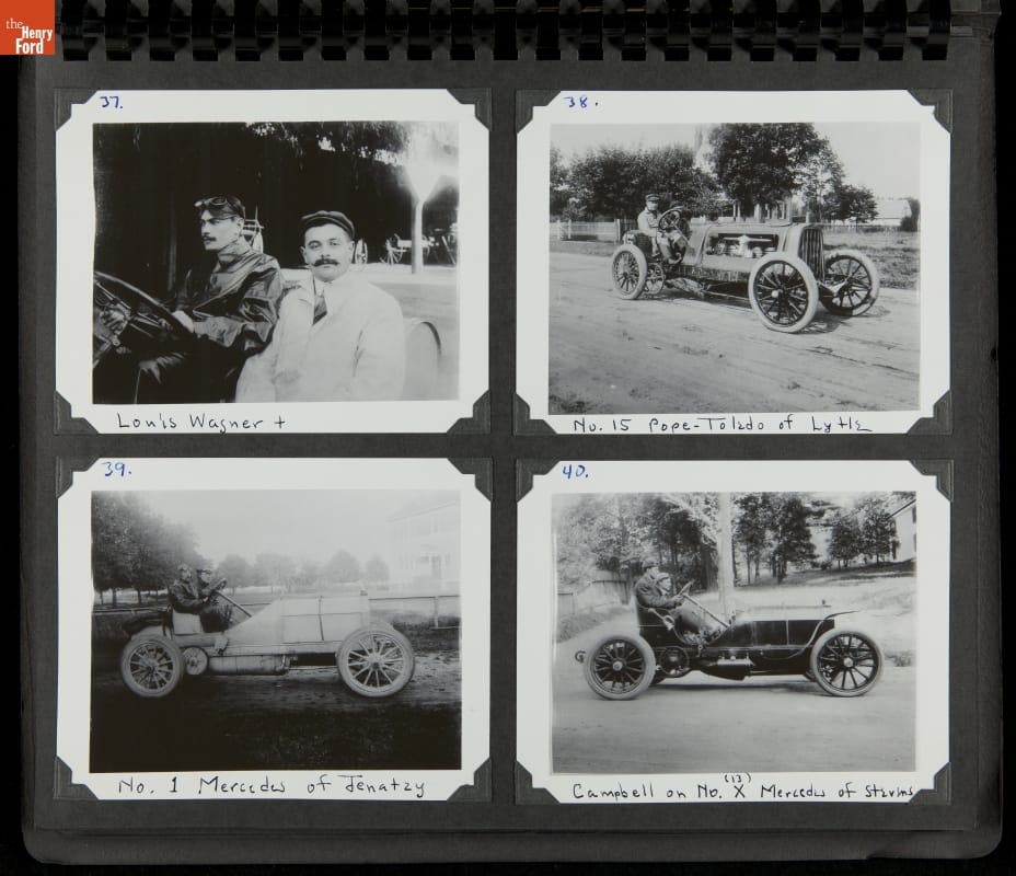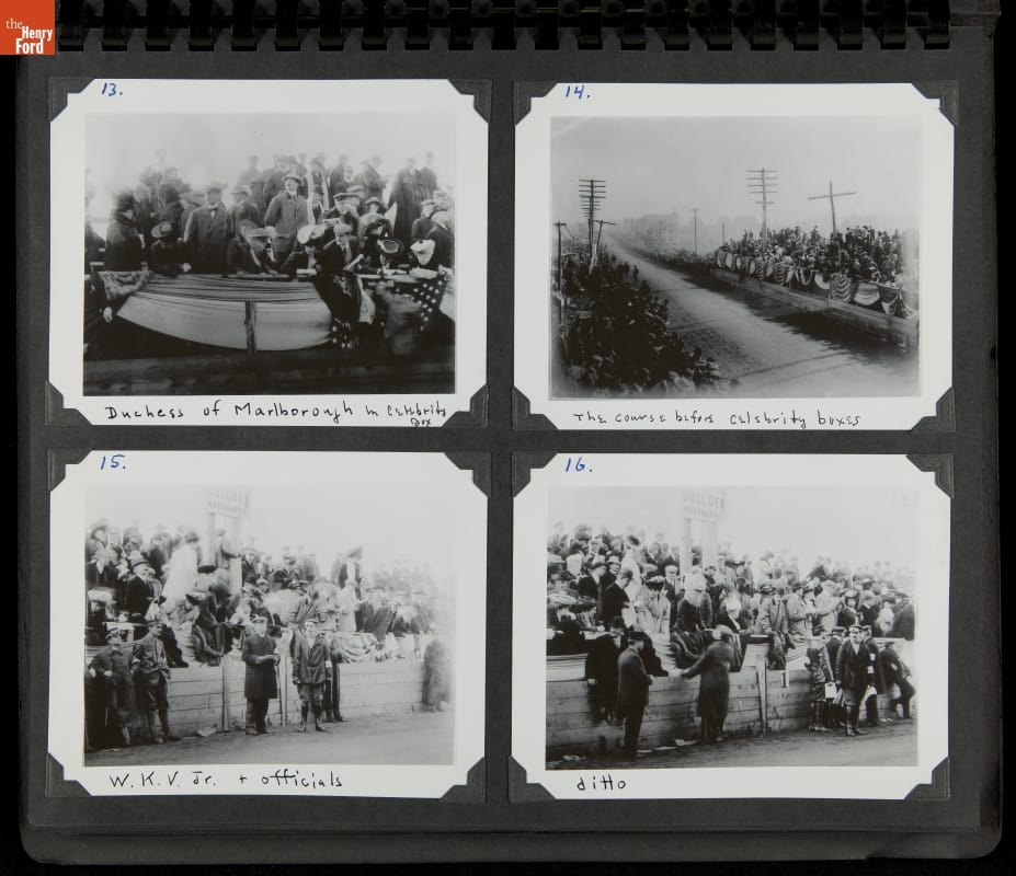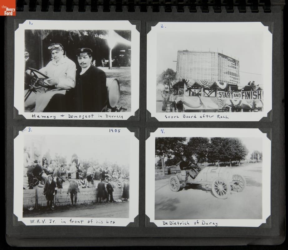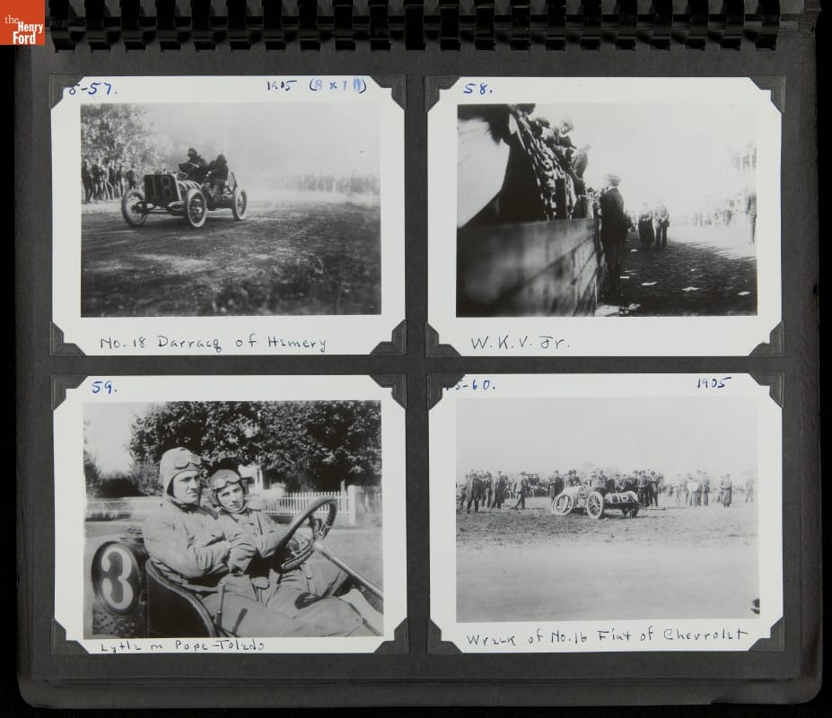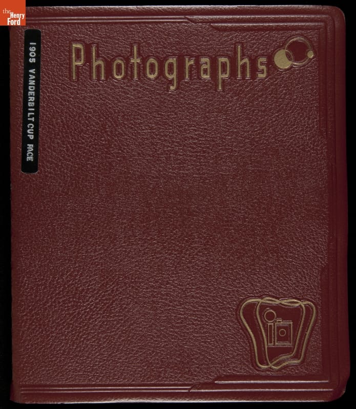 The Vanderbilt Cup, held on New York's Long Island from 1904 to 1910, was America's first internationally prominent automobile race. William K. Vanderbilt, Jr., a wealthy railroad heir, organized the competition over public roads. European cars dominated the event's first years. This photo album documents the 1905 race, won by French driver Victor Hemery in a French-built Darracq.