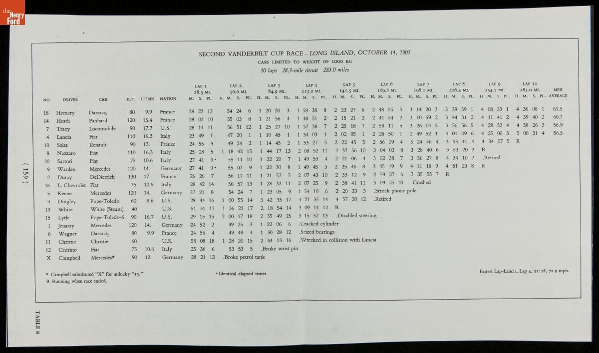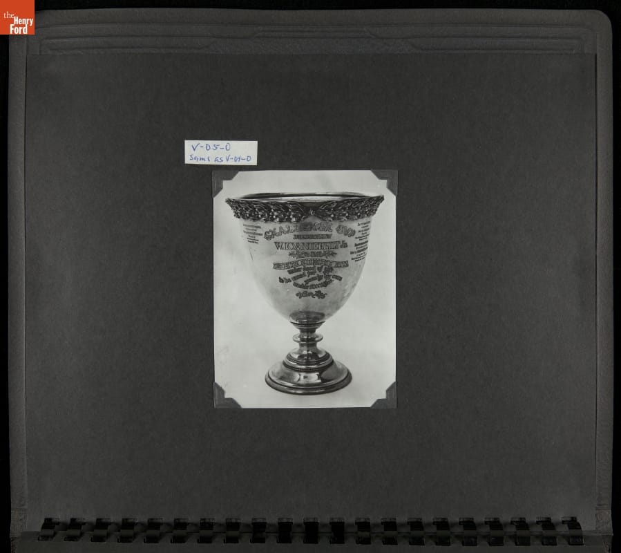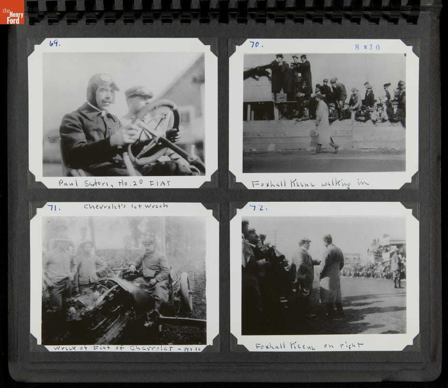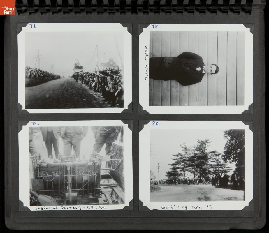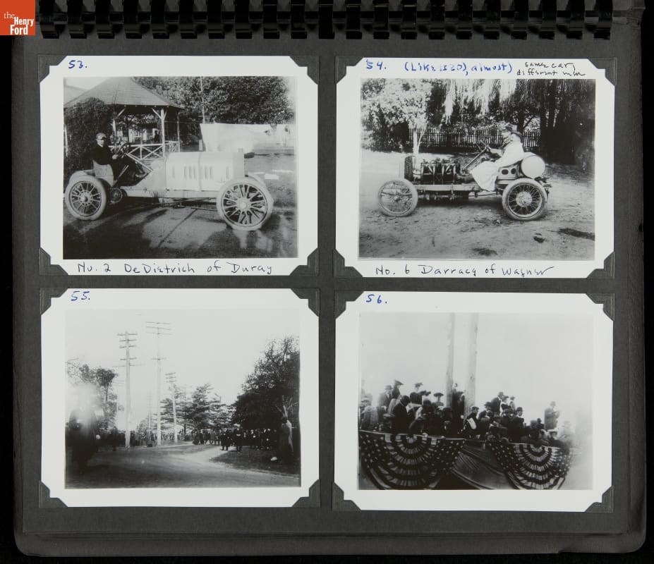 The Vanderbilt Cup, held on New York's Long Island from 1904 to 1910, was America's first internationally prominent automobile race. William K. Vanderbilt, Jr., a wealthy railroad heir, organized the competition over public roads. European cars dominated the event's first years. This photo album documents the 1905 race, won by French driver Victor Hemery in a French-built Darracq.