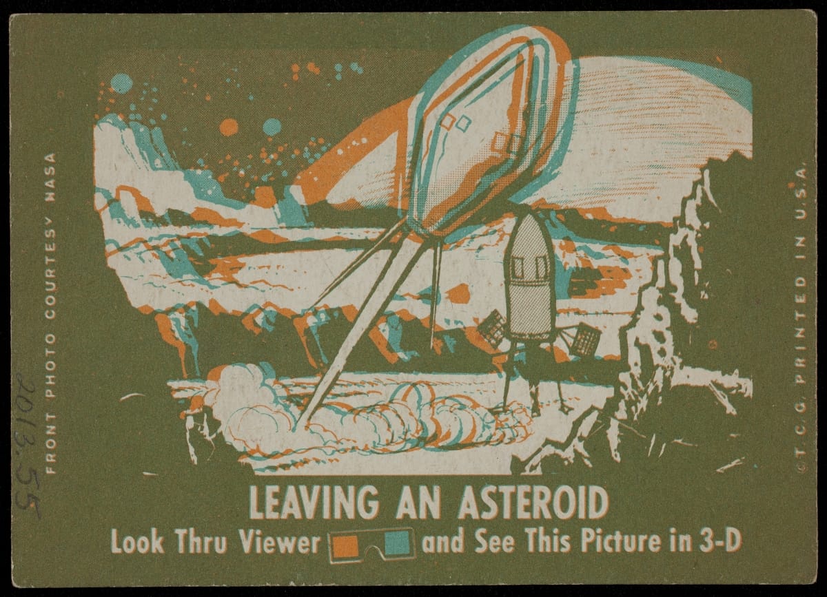President John F. Kennedy's vision to explore the "new frontier" of space ignited the public's imagination. Pictorial souvenir cards like this helped generate excitement about the latest achievements in the space program. The U.S. astronauts and their accomplishments dominate the card fronts, while the backs show drawings that blend elements of science fiction and fantasy-requiring 3-D glasses to view.