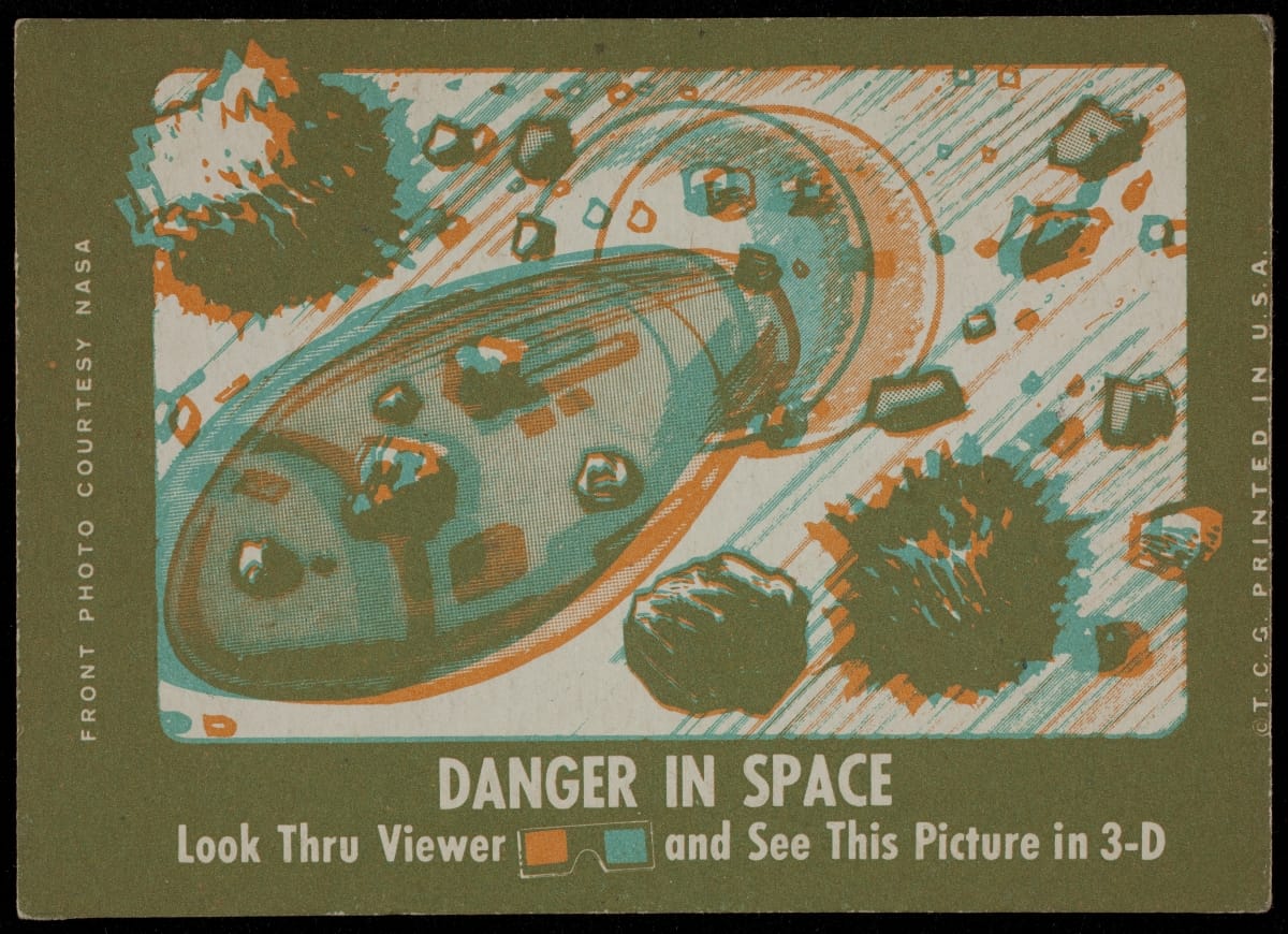 President John F. Kennedy's vision to explore the "new frontier" of space ignited the public's imagination. Pictorial souvenir cards like this helped generate excitement about the latest achievements in the space program. The U.S. astronauts and their accomplishments dominate the card fronts, while the backs show drawings that blend elements of science fiction and fantasy-requiring 3-D glasses to view.