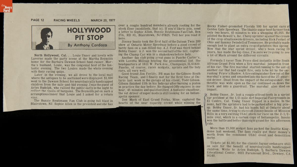 Bobby Unser earned a place among automobile racing's greats, having successfully competed in nearly every form of the sport. The racing career of this three-time Indianapolis 500 winner and 13-time Pikes Peak International Hill Climb winner spanned more than 30 years. This clipping -- part of a large archival donation from Bobby and Lisa Unser to The Henry Ford -- helps to document his career.