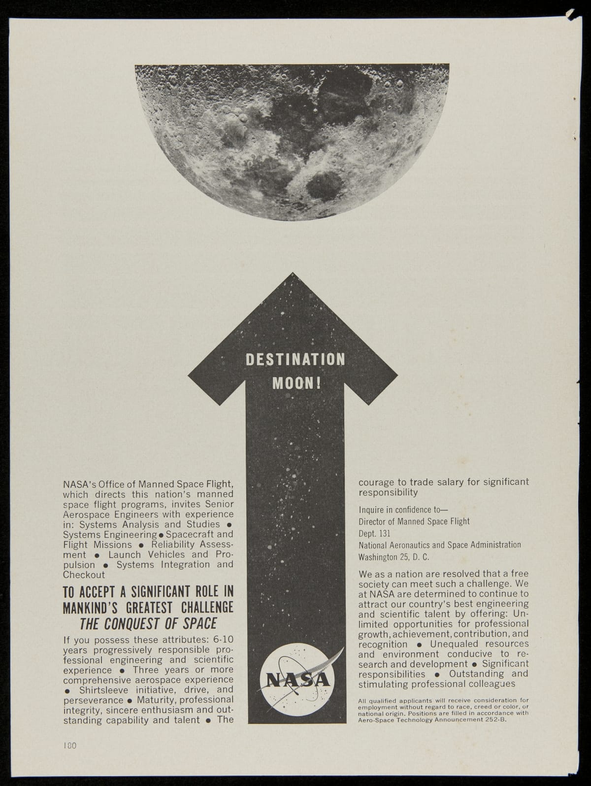 DESTINATION / MOON! / NASA's Office of Manned Space Flight, / which directs this nation's manned / space flight programs, invites Senior / Aerospace Engineers with experience / in [list] ... TO ACCESPT A SIGNIFICANT ROLE IN / MANKIND'S GREATEST CHALLENGE / THE CONQUEST OF SPACE... / All qualified applicants will receive consideration... /