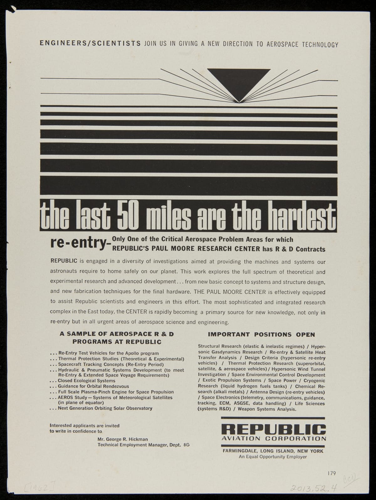 President John F. Kennedy's vision to explore the "new frontier" of space ignited the public's imagination. It was also an overt Cold War strategy against the Soviet Union which launched the first man in space April 12, 1961. NASA published this ad series in 1962 to convince aerospace engineers and scientists to join them for the U.S. effort to conquer space.