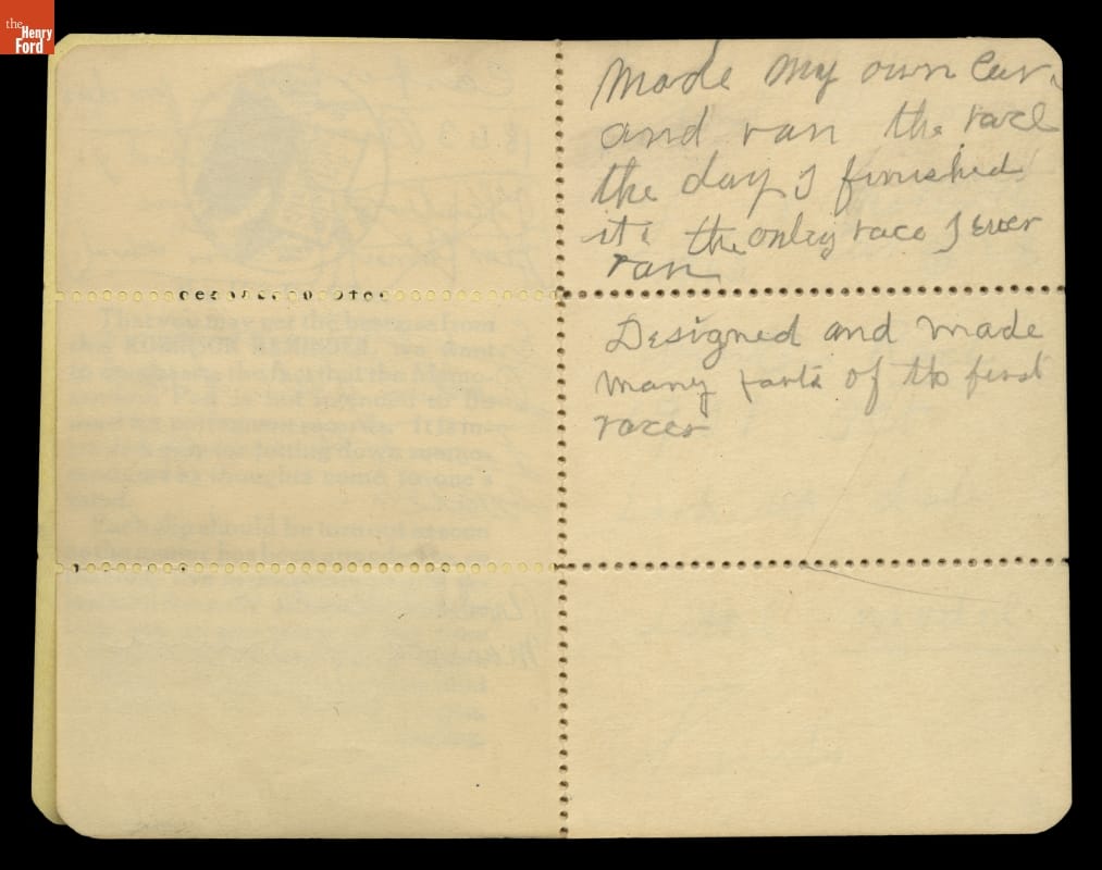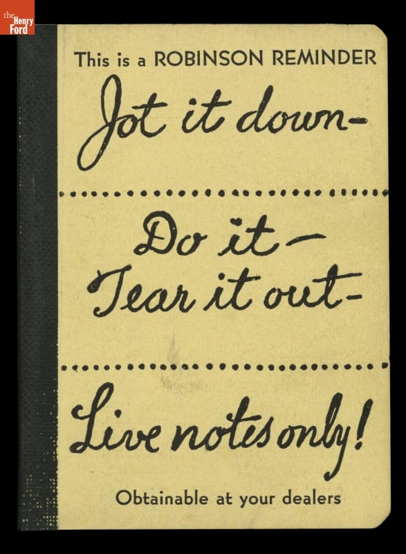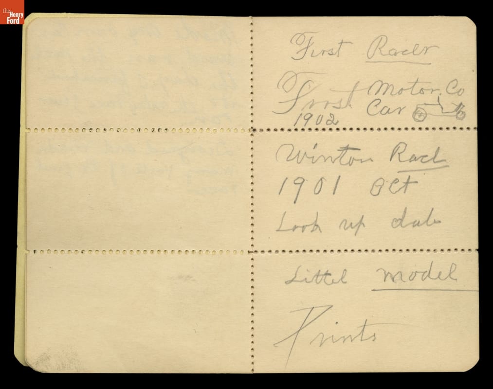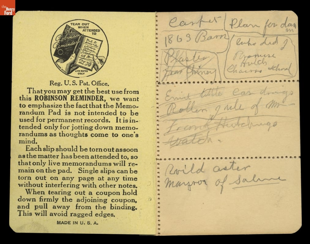 Henry Ford always carried a small notebook to jot down important pieces of information or simple reminders of things to remember. The over 50 small jot books give a sense of a busy man trying to capture information on the fly. The contents vary from questions to ask Thomas Edison to names and addresses to grocery lists.