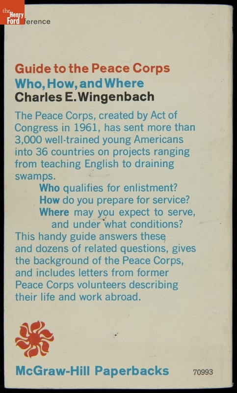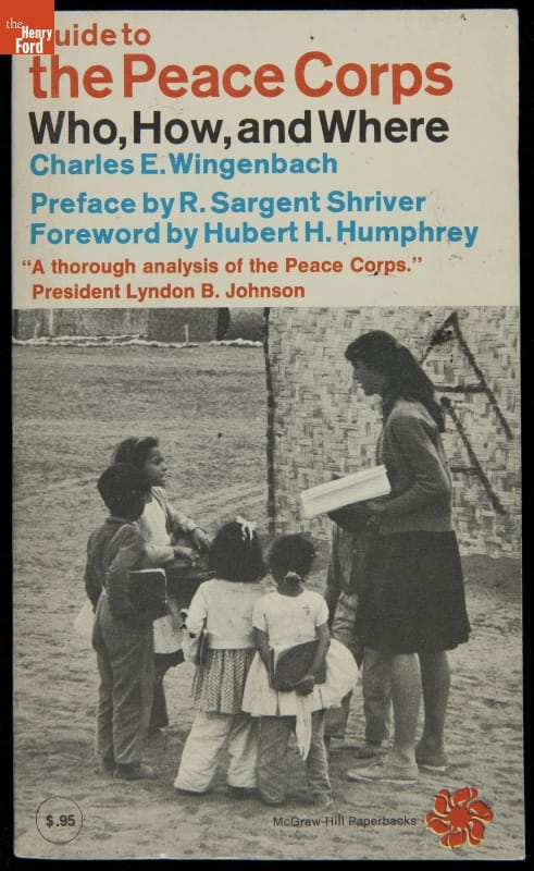 President John F. Kennedy recognized the Peace Corps as an opportunity to spread goodwill and as a positive weapon against the Cold War. Established March 1, 1961, this 1965 paperback book includes a quote from President Lyndon Johnson, who supported continuing the program Kennedy began. Interested people could learn about how they could contribute to the Peace Corps by reading this book.
