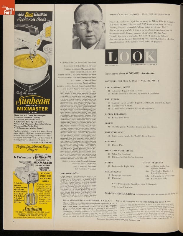 Look magazine was one of the popular documenters of American life at the time of John F. Kennedy's presidency. This issue featured James A. Michener's new book on the 1960 Kennedy campaign. Although the Look editors did not share Michener's views, they thought readers would be interested in this account by a "highly articulate Democrat."