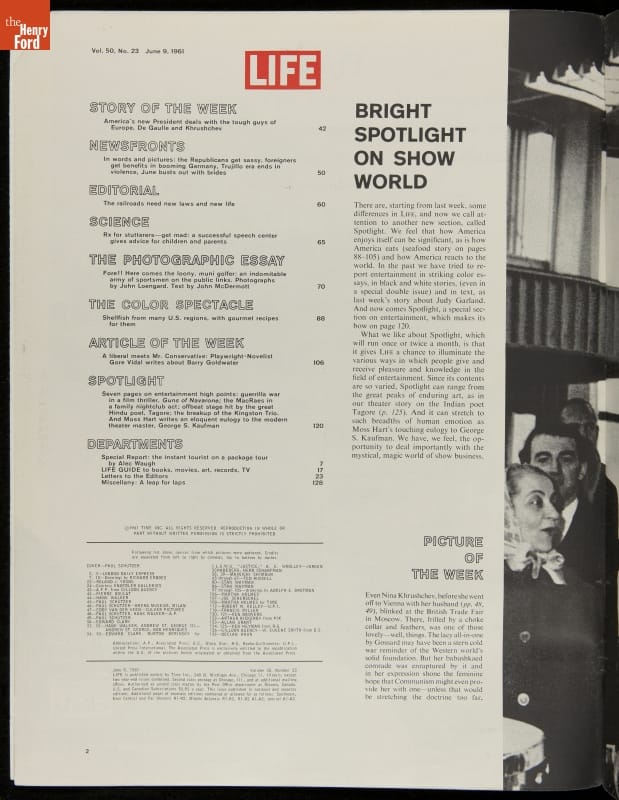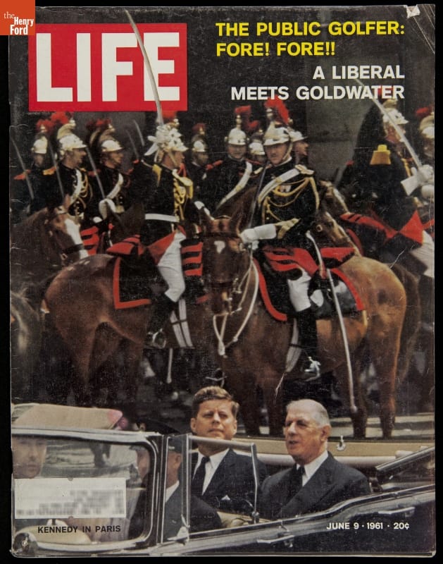 Life magazine often featured exclusive photo-essays on John F. Kennedy's travels. This Life magazine cover depicts President Kennedy riding in an open-top car with France's president, Charles de Gaulle. Kennedy's visit to Europe also included a two-day "frank discussion" with Premier Khrushchev of the Soviet Union about the Cold War.