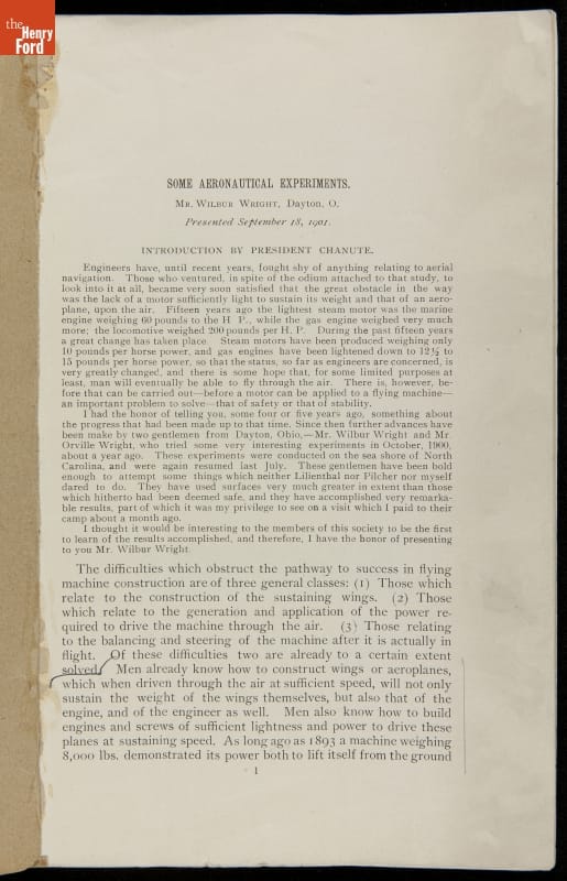 Pamphlet, "Some Aeronautical Experiments," Wilbur Wright, 1901