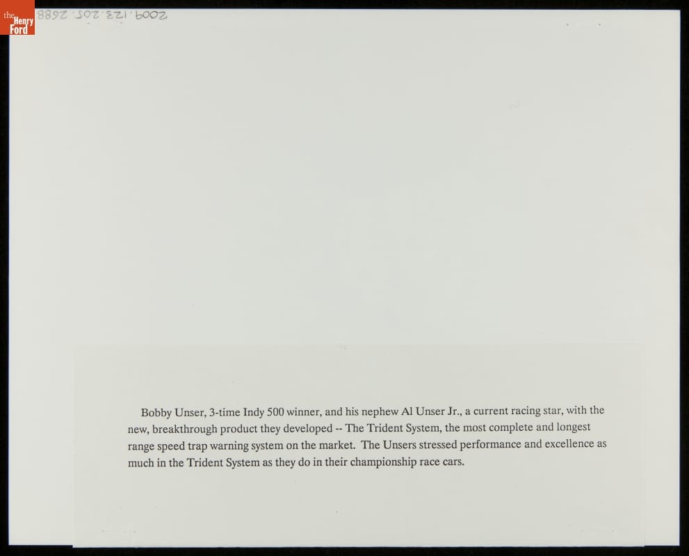 Bobby Unser earned a place among automobile racing's greats, having successfully competed in nearly every form of the sport. The racing career of this three-time Indianapolis 500 winner and 13-time Pikes Peak International Hill Climb winner spanned more than 30 years. This photograph -- only one of thousands donated by Bobby and Lisa Unser to The Henry Ford -- helps to document his career.