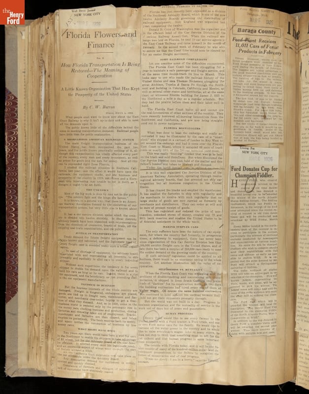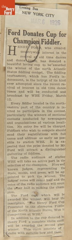 Ford Motor Company kept scrapbooks of newspaper articles about Ford Motor Company and Henry Ford's activities. This volume contains articles relating to Henry Ford's interest in reviving "old time" fiddling. People in various parts of the country joined in, organizing fiddling contests. Henry Ford provided a trophy for the winner of the North Atlantic States fiddling competition held in Boston in March 1926.