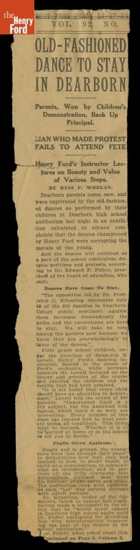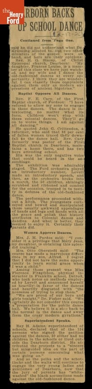 Newspaper Article, "Old-Fashioned Dance to Stay in Dearborn...Dearborn Backs Up School Dance," 1926