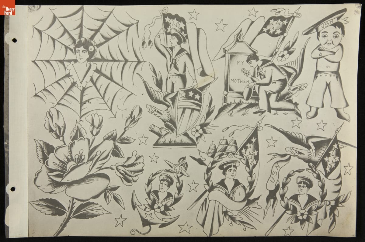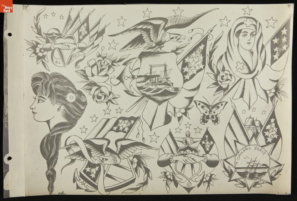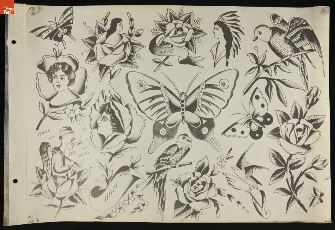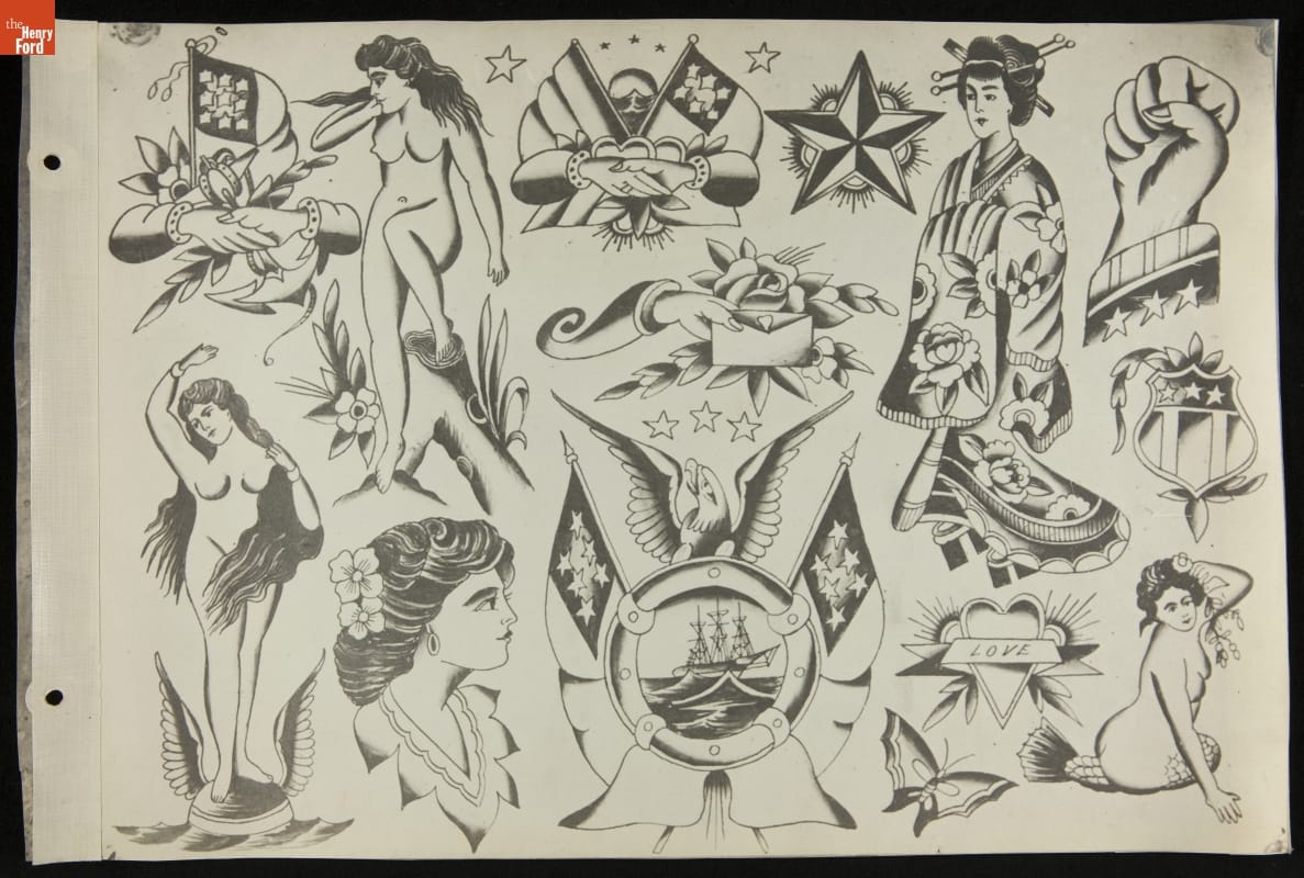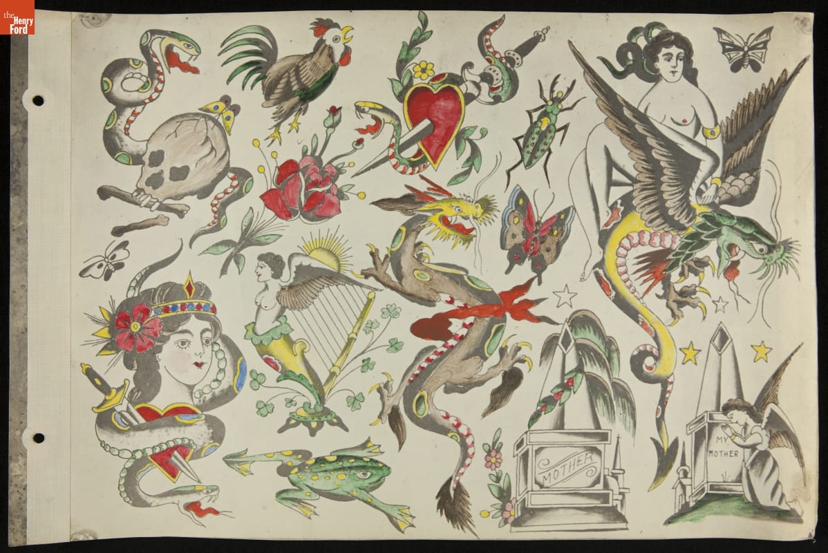Tattoos communicate stories. Their content ranges from deeply personal and traditional--to regrettable and frivolous. In the early 1900s, "Professor" Waters apprenticed as a tattoo artist in carnivals and New York's Bowery District. He ran a successful supply shop in Detroit (1918-1939), patenting the standard "two-coil" tattoo machine in 1929. Designs from his flash sheets continue to inspire tattooists today.