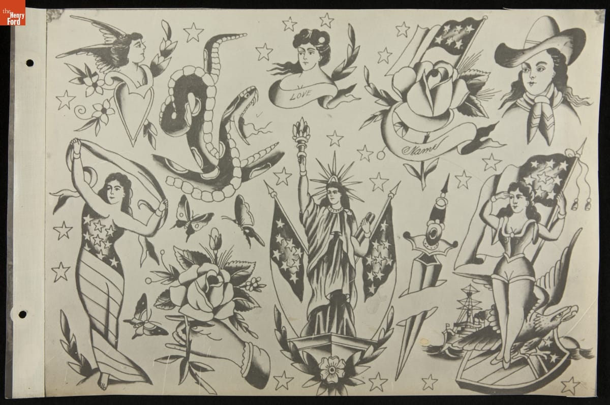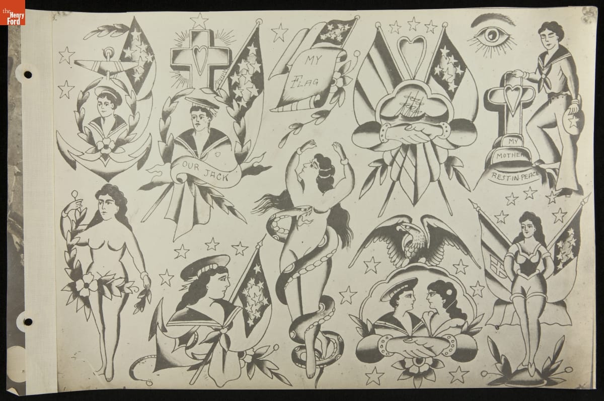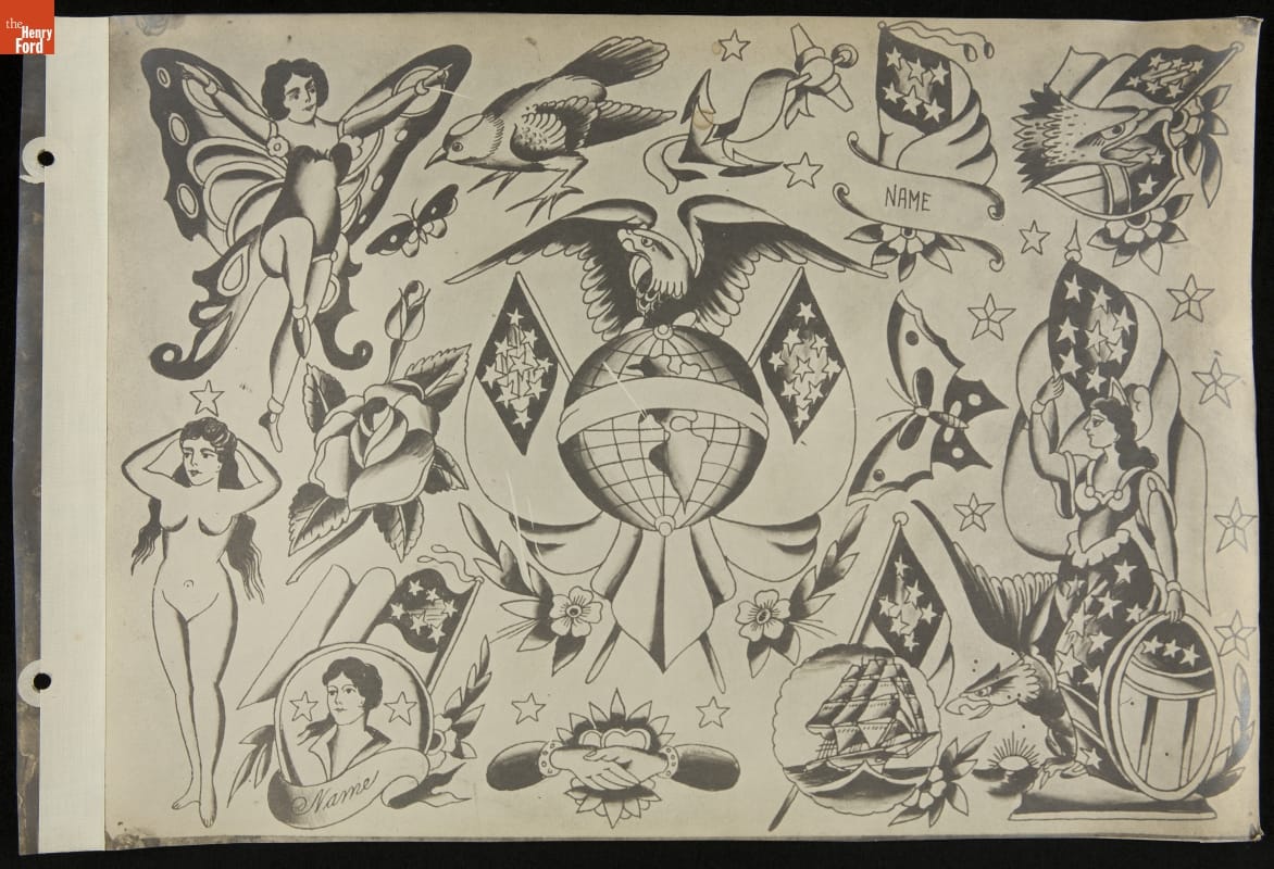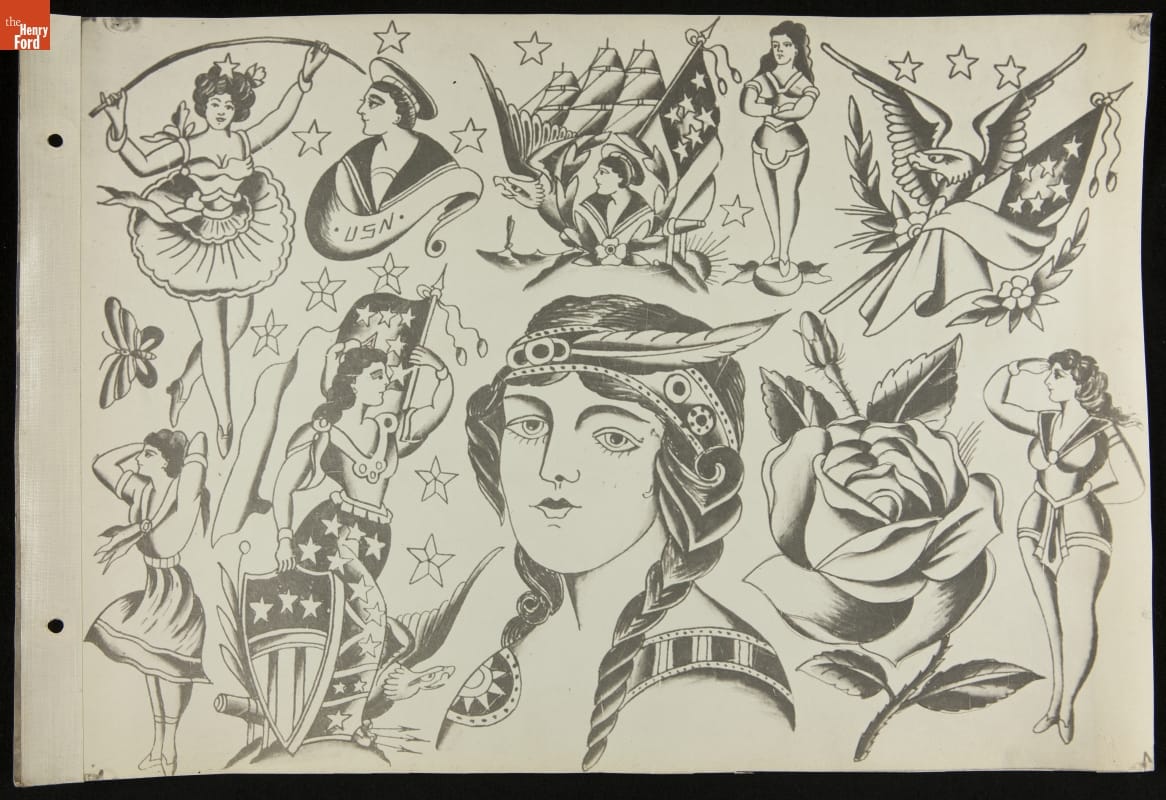 Tattoos communicate stories. Their content ranges from deeply personal and traditional--to regrettable and frivolous. In the early 1900s, "Professor" Waters apprenticed as a tattoo artist in carnivals and New York's Bowery District. He ran a successful supply shop in Detroit (1918-1939), patenting the standard "two-coil" tattoo machine in 1929. Designs from his flash sheets continue to inspire tattooists today.