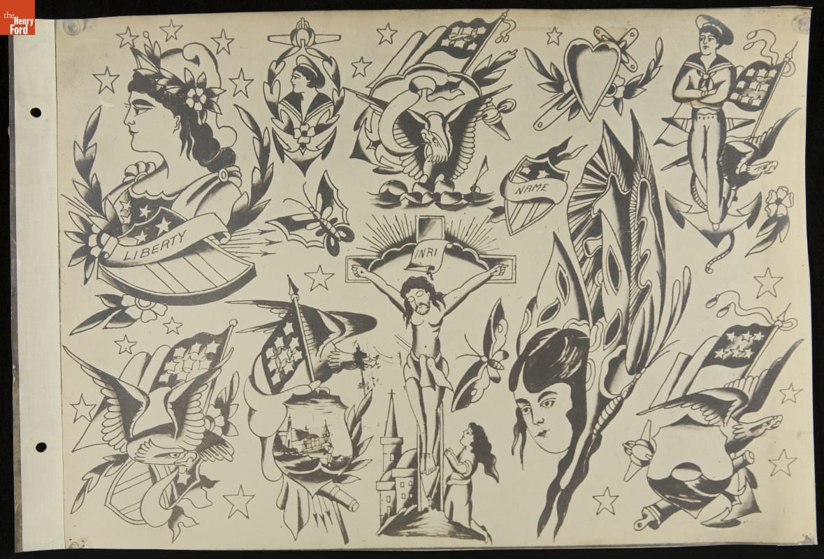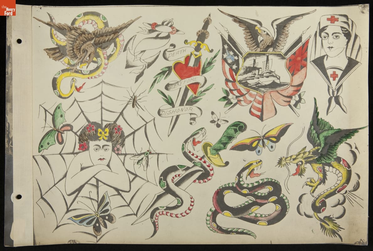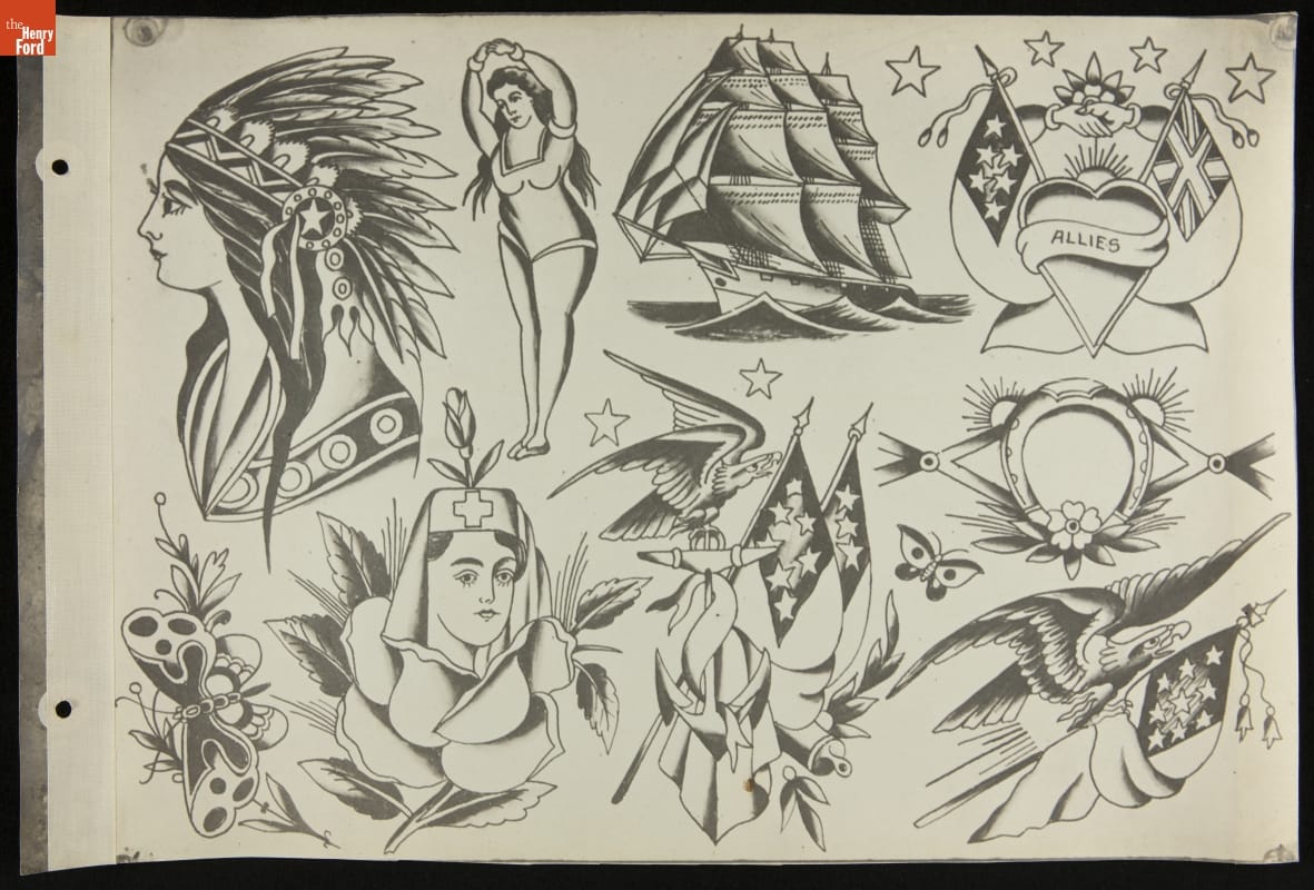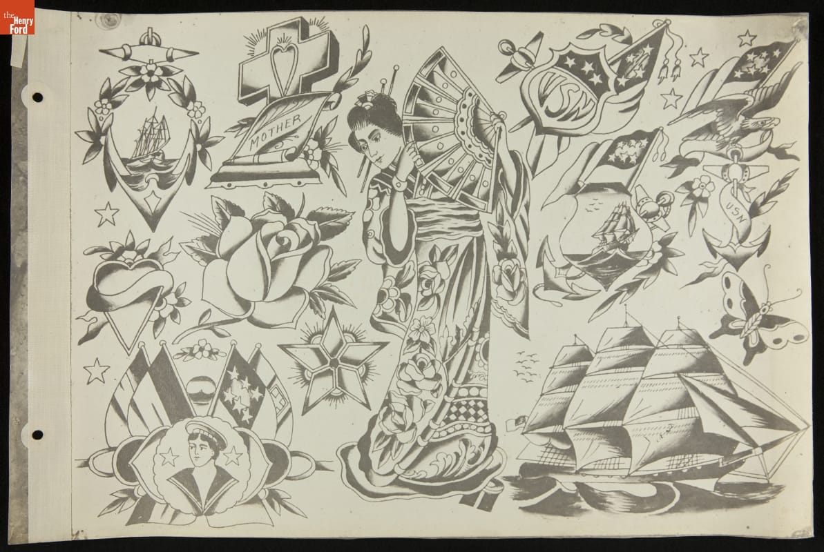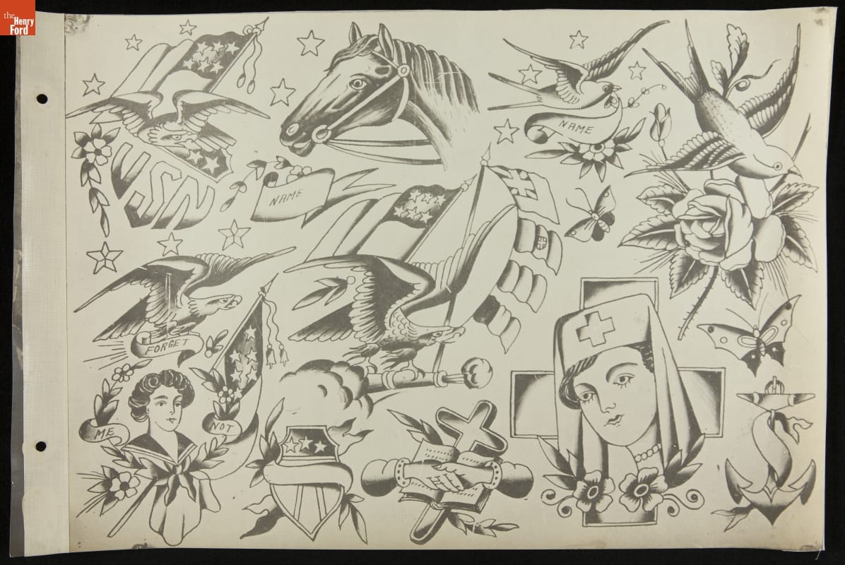 Tattoos communicate stories. Their content ranges from deeply personal and traditional--to regrettable and frivolous. In the early 1900s, "Professor" Waters apprenticed as a tattoo artist in carnivals and New York's Bowery District. He ran a successful supply shop in Detroit (1918-1939), patenting the standard "two-coil" tattoo machine in 1929. Designs from his flash sheets continue to inspire tattooists today.