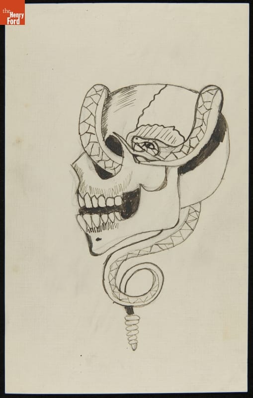 Tattoos communicate stories. Their content ranges from deeply personal and traditional--to regrettable and frivolous. In the early 1900s, "Professor" Waters apprenticed as a tattoo artist in carnivals and New York's Bowery District. He ran a successful supply shop in Detroit (1918-1939), patenting the standard "two-coil" tattoo machine in 1929. Designs from his flash sheets continue to inspire tattooists today.