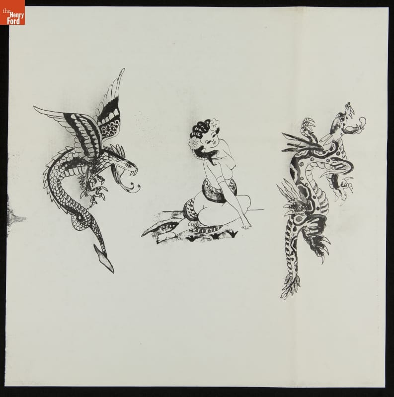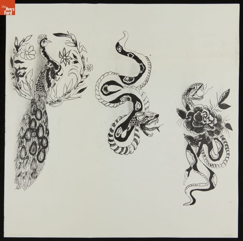 Tattoos communicate stories. Their content ranges from deeply personal and traditional--to regrettable and frivolous. In the early 1900s, "Professor" Waters apprenticed as a tattoo artist in carnivals and New York's Bowery District. He ran a successful supply shop in Detroit (1918-1939), patenting the standard "two-coil" tattoo machine in 1929. Designs from his flash sheets continue to inspire tattooists today.