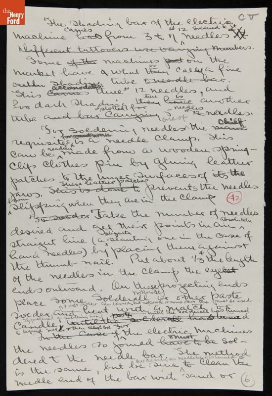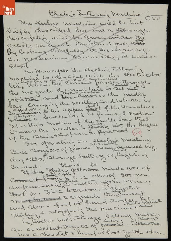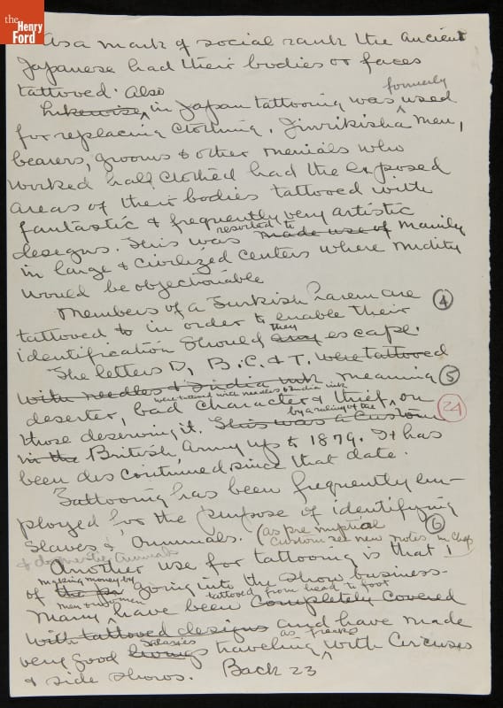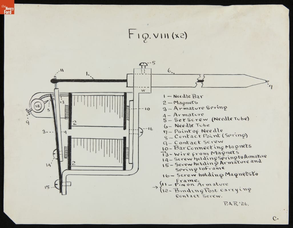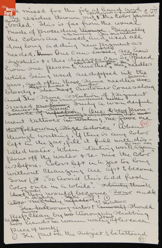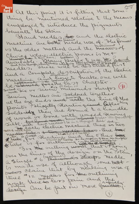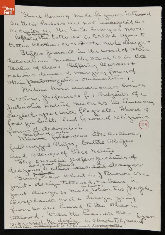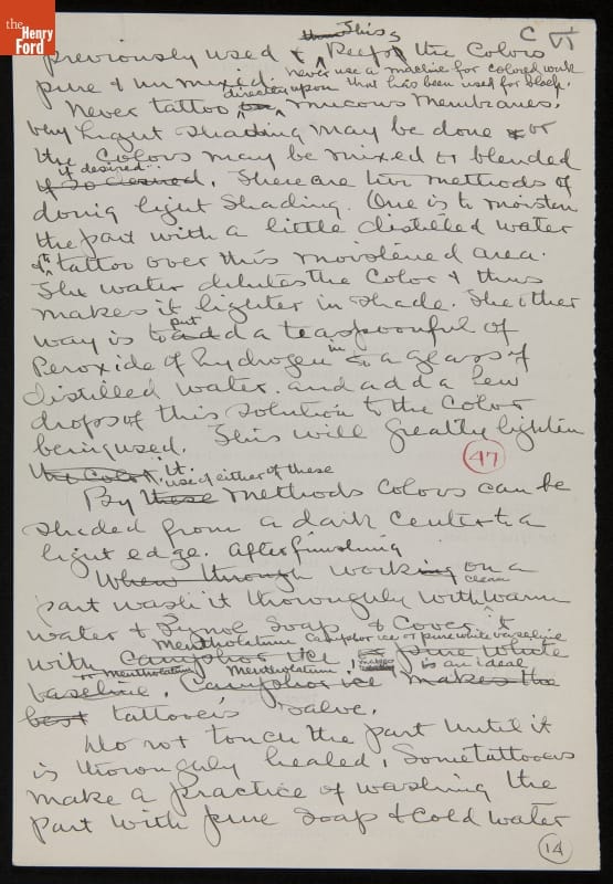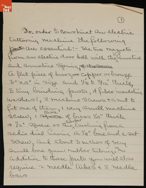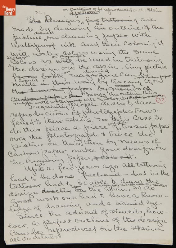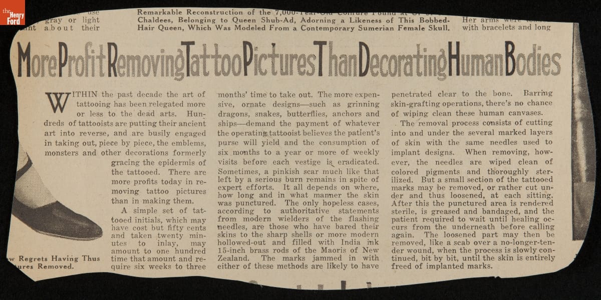 Tattoos communicate stories. Their content ranges from deeply personal and traditional--to regrettable and frivolous. In the early 1900s, "Professor" Waters apprenticed as a tattoo artist in carnivals and New York's Bowery District. He ran a successful supply shop in Detroit (1918-1939), patenting the standard "two-coil" tattoo machine in 1929. Designs from his flash sheets continue to inspire tattooists today.