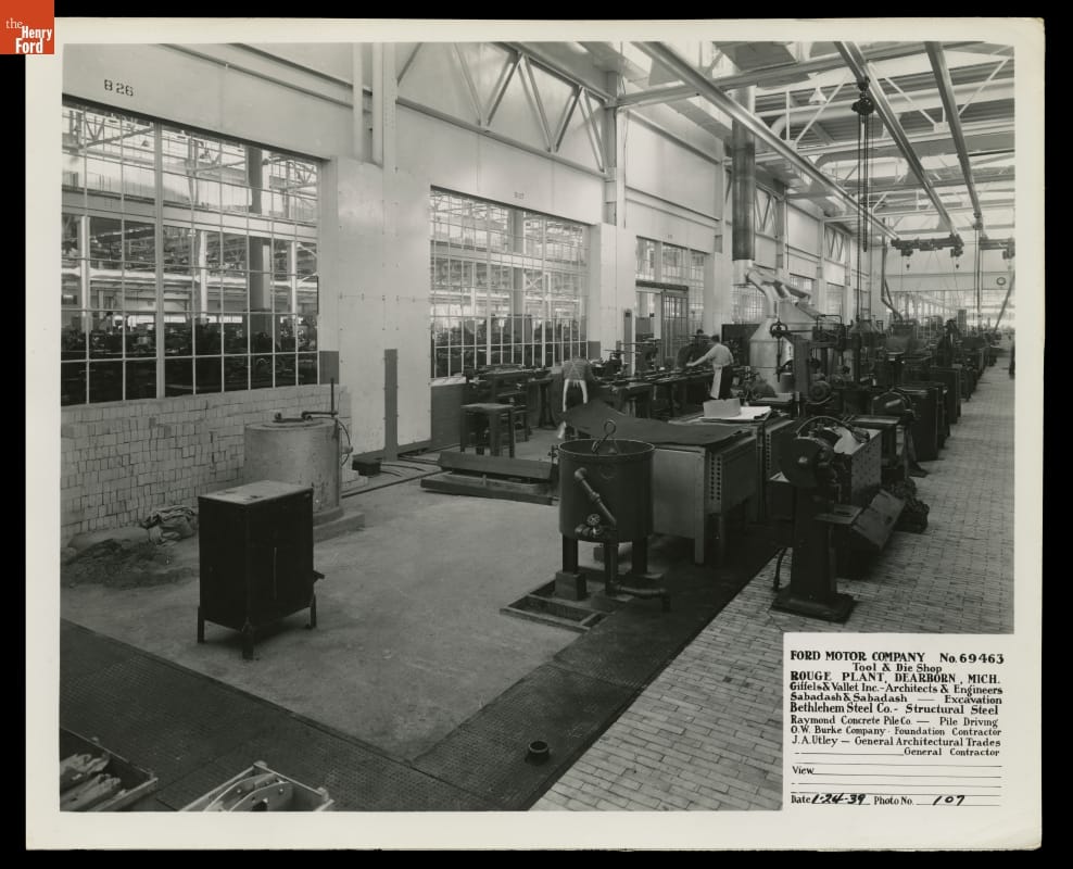 FORD MOTOR COMPANY No. 69463 / Tool & Die Shop / ROUGE PLANT, DEARBORN, MICH. / Giffels & Vallet Inc. Architects & Engineers / Sabadash & Sabadash- Excavators / Bethlehem Steel Co.- Structural Steel / Raymond Concrete Pile Co.- Pile Driving / O.W. Burke Company- Foundation Contractor / J.A. Utley- General Architectural Trades / General Contractor / Date 1-24-39/ Photo No 107