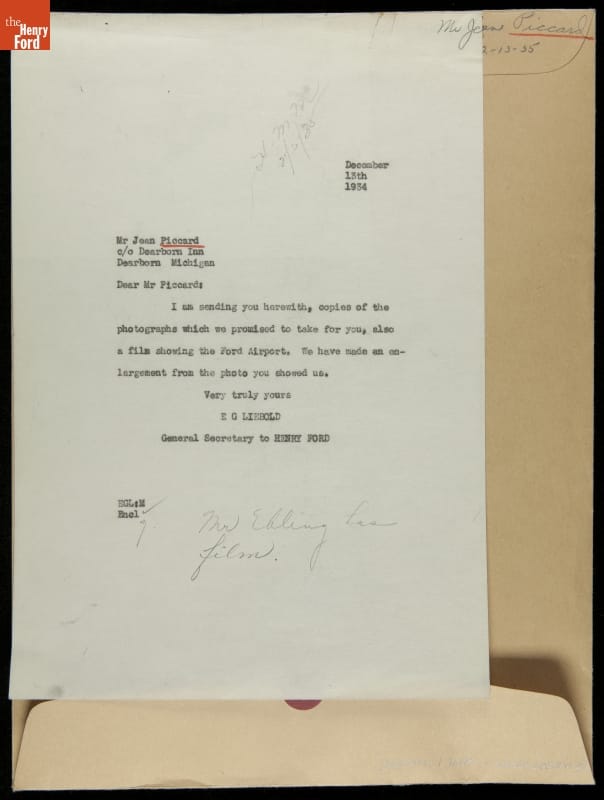 Letter and photographs sent to Jean Piccard by Ernest Liebold, General Secretary to Henry Ford.