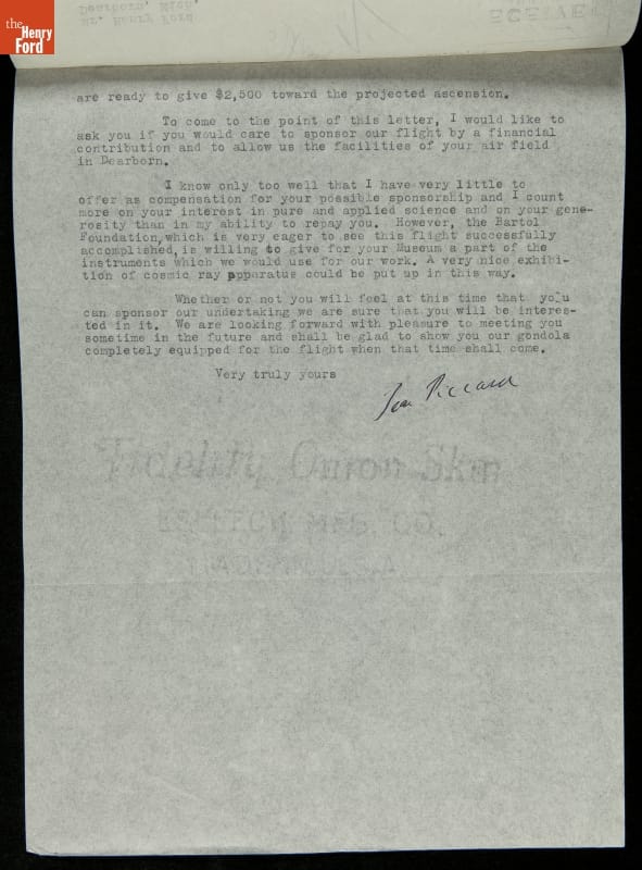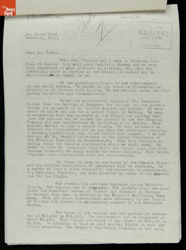 Letter from Jean Piccard to Henry Ford regarding Proposed Stratosphere Balloon Flight, Received January 31, 1934