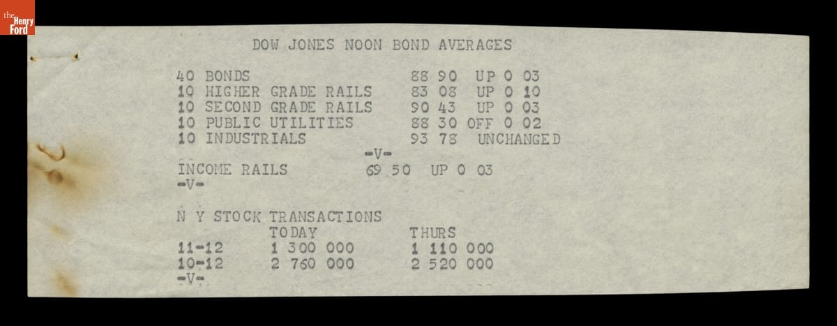 In the routine course of business, Ford Motor Company received a steady flow of news and financial reports from the Wall Street Journal. These dispatches came over the teletype machine on November 22, 1963 describing events from the arrival of President John F. Kennedy and his wife Jacqueline in Dallas through the official report of his death several hours later.