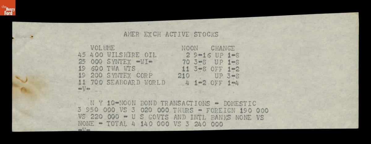 In the routine course of business, Ford Motor Company received a steady flow of news and financial reports from the Wall Street Journal. These dispatches came over the teletype machine on November 22, 1963 describing events from the arrival of President John F. Kennedy and his wife Jacqueline in Dallas through the official report of his death several hours later.