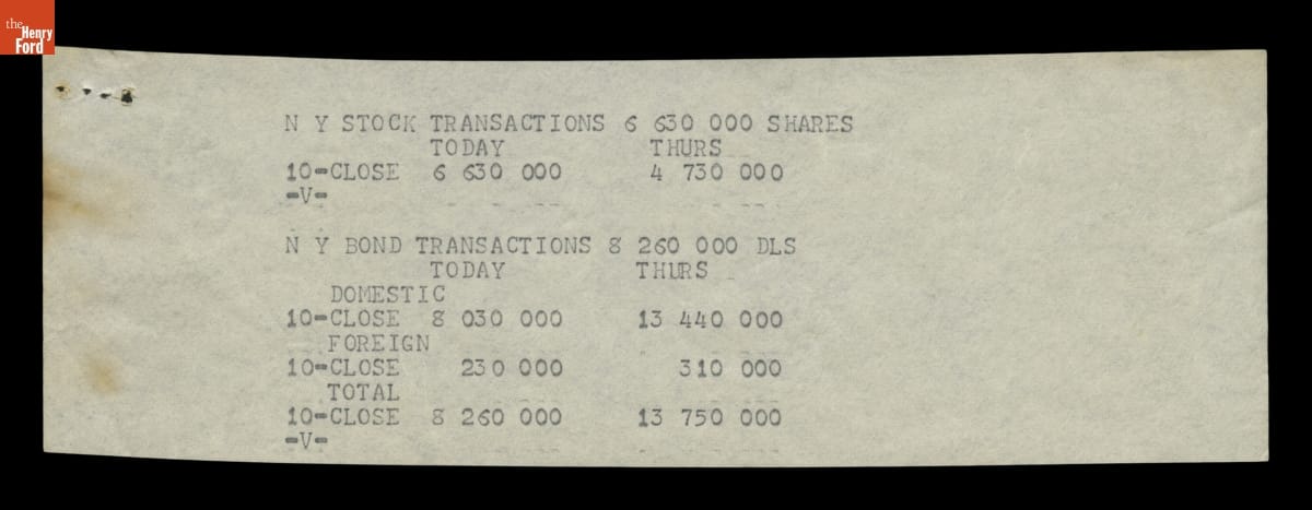 In the routine course of business, Ford Motor Company received a steady flow of news and financial reports from the Wall Street Journal. These dispatches came over the teletype machine on November 22, 1963 describing events from the arrival of President John F. Kennedy and his wife Jacqueline in Dallas through the official report of his death several hours later.