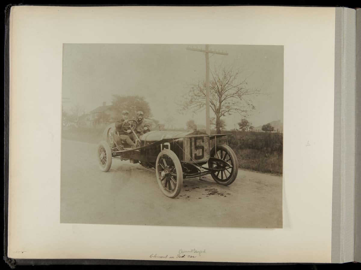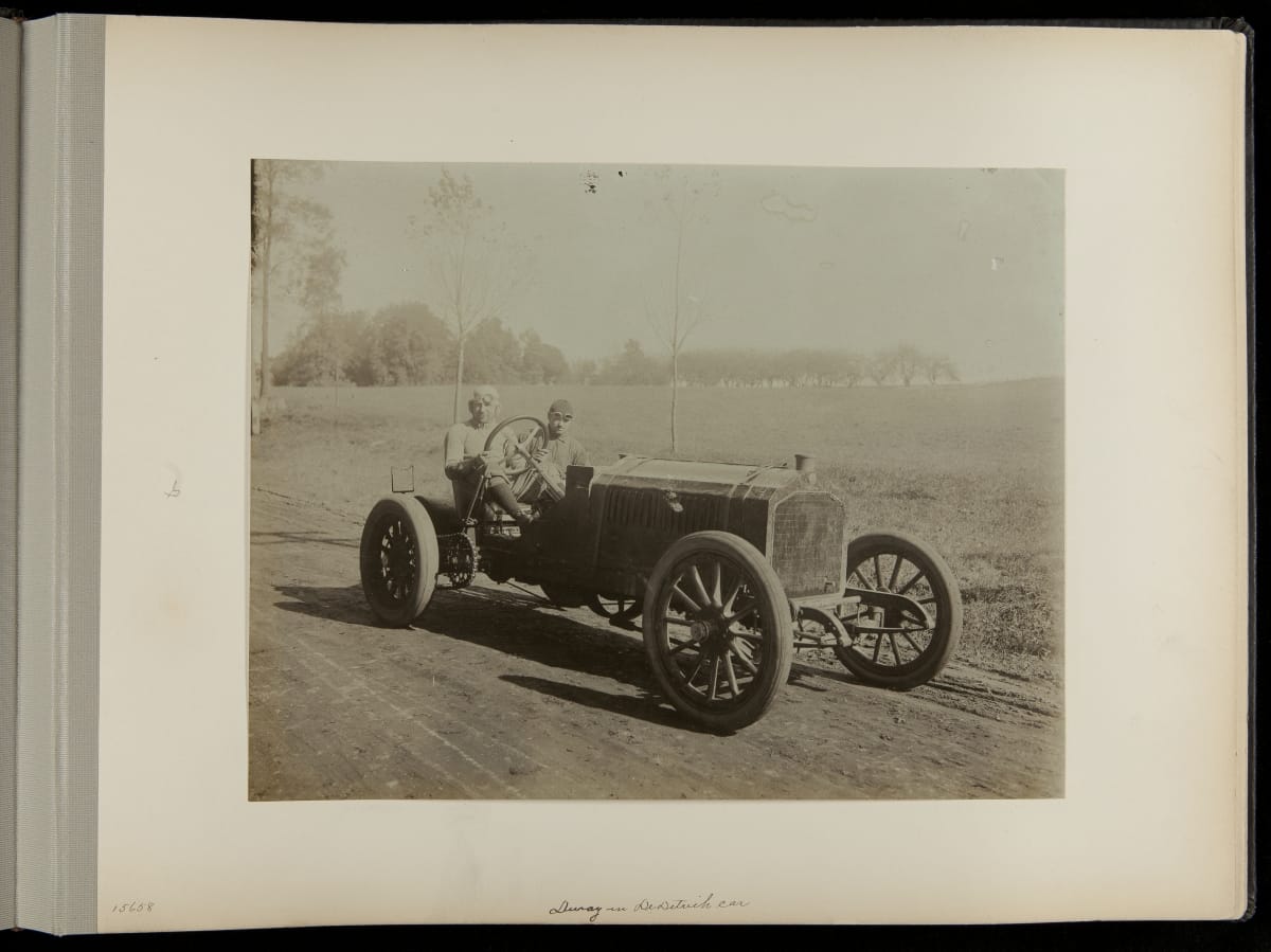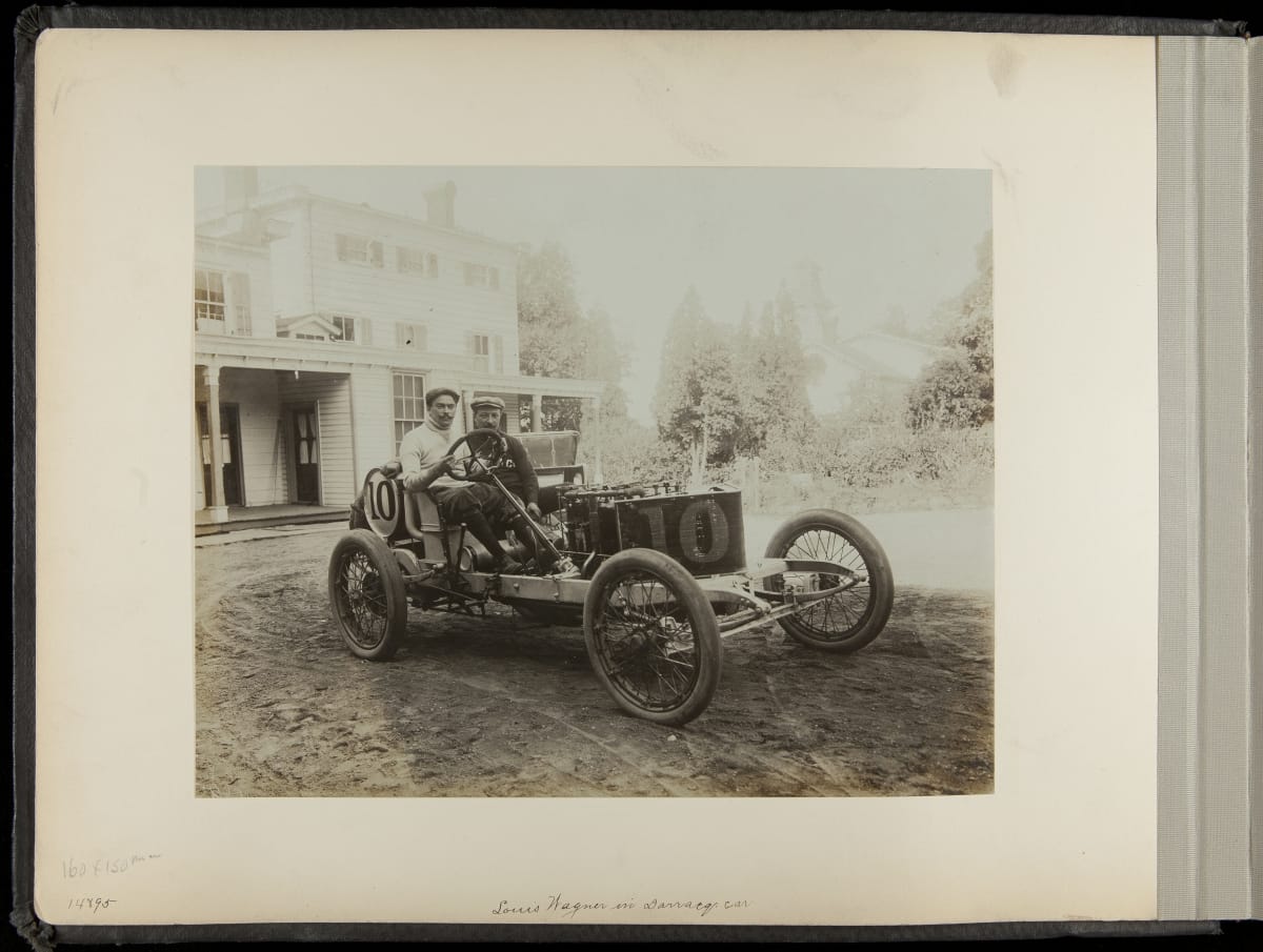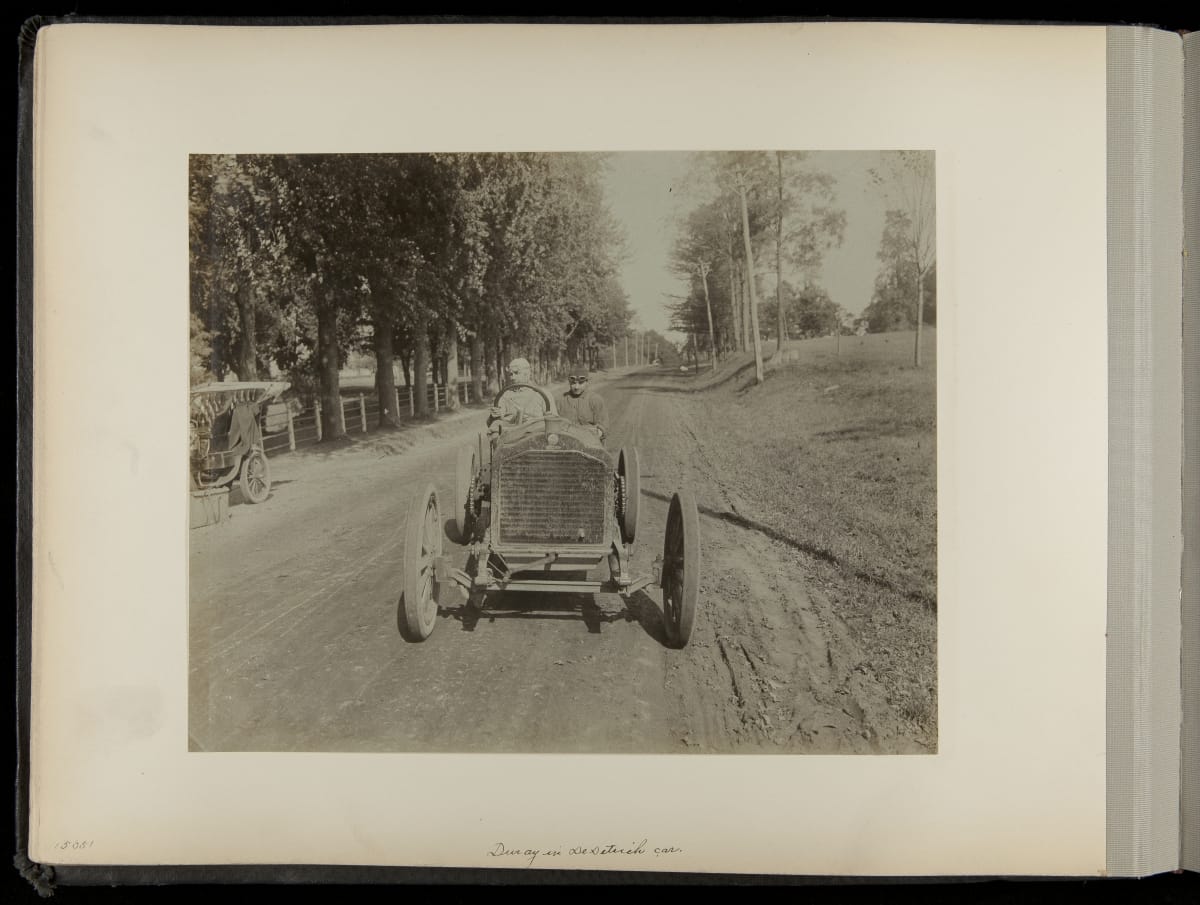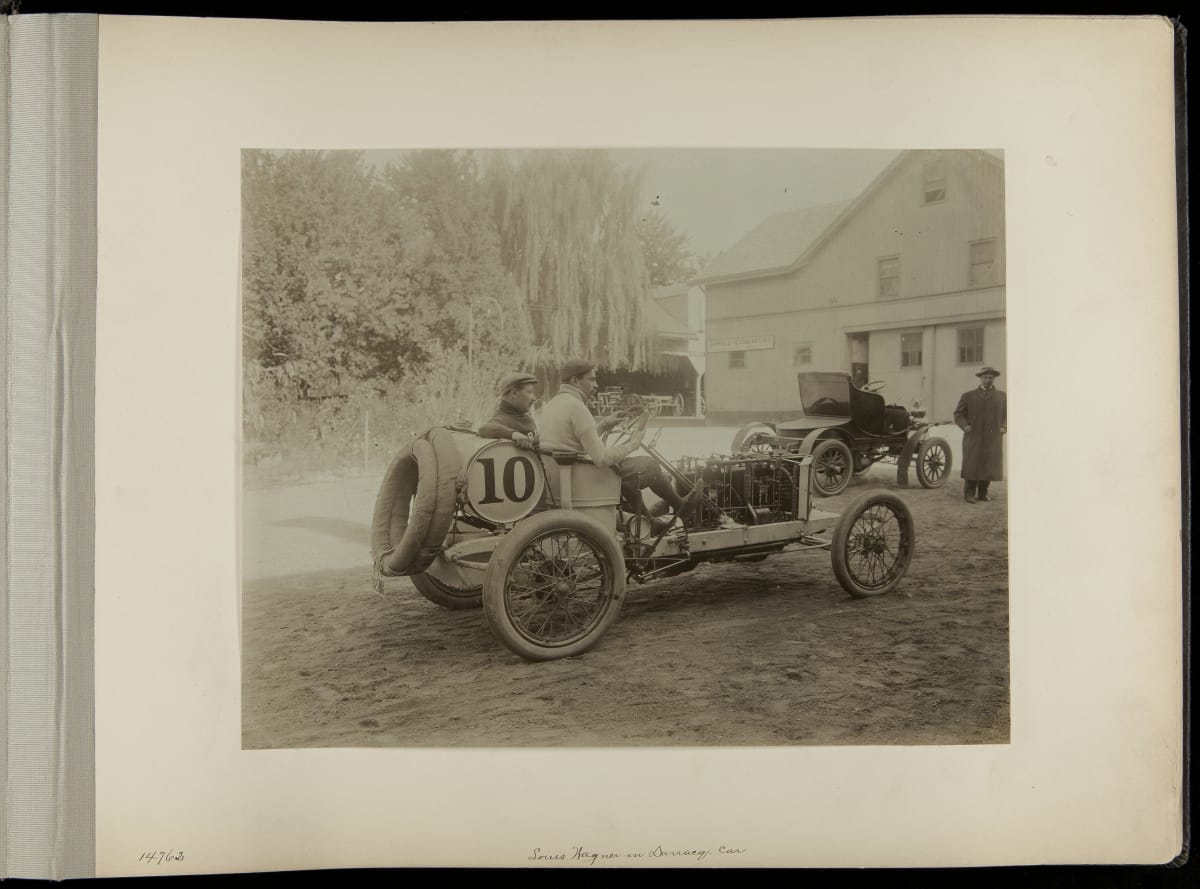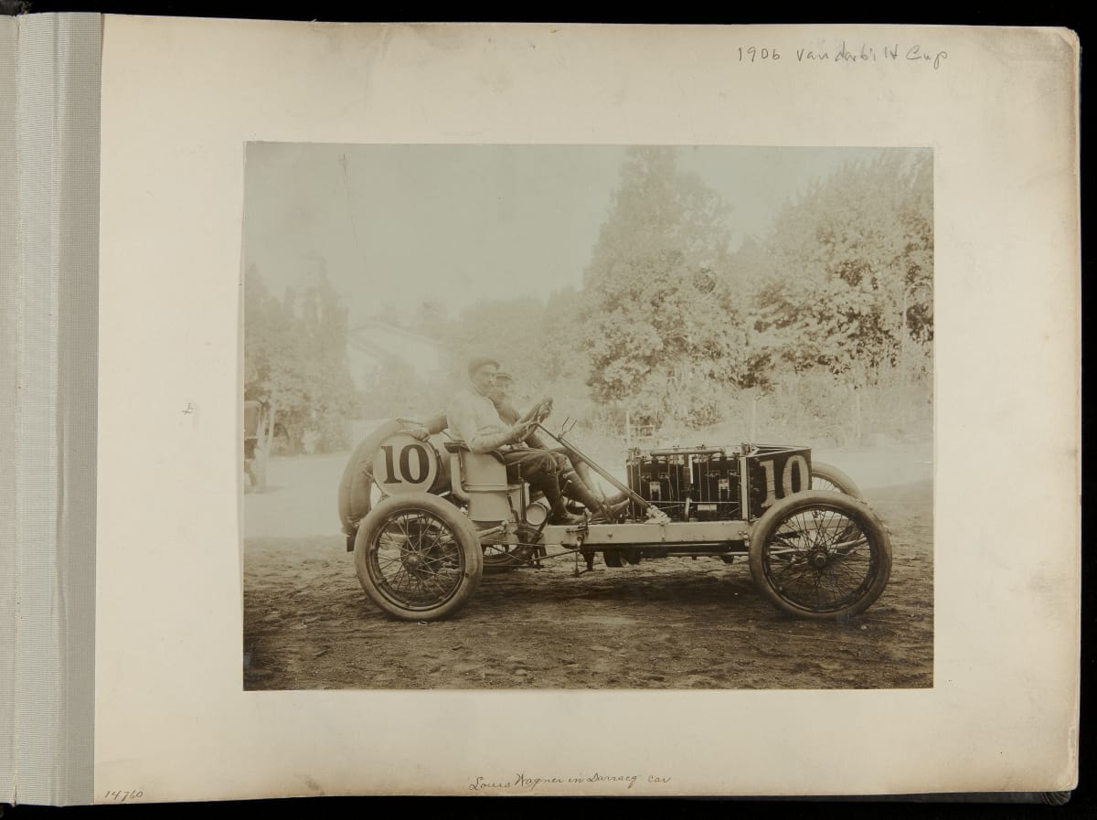 The Vanderbilt Cup, held on New York's Long Island from 1904 to 1910, was America's first internationally prominent automobile race. William K. Vanderbilt, Jr., a wealthy railroad heir, organized the competition over public roads. European cars dominated the event's first years. This photo album documents the 1906 race, won by French driver Louis Wagner in a French-built Darracq.