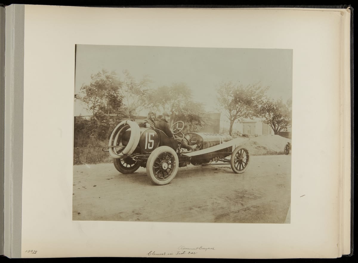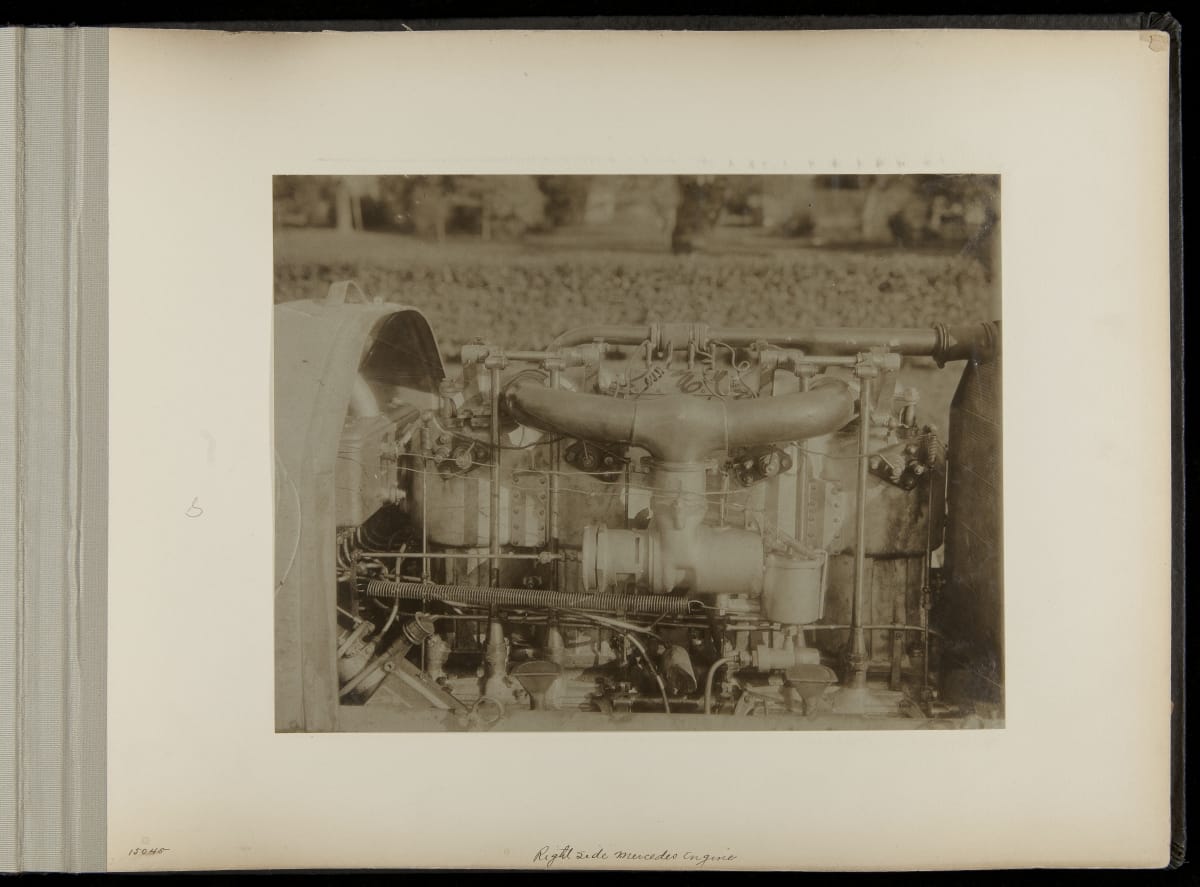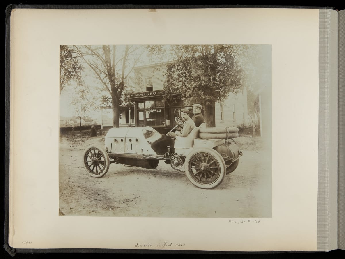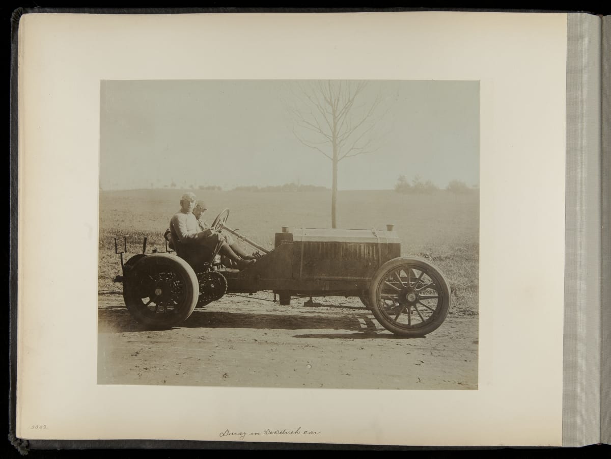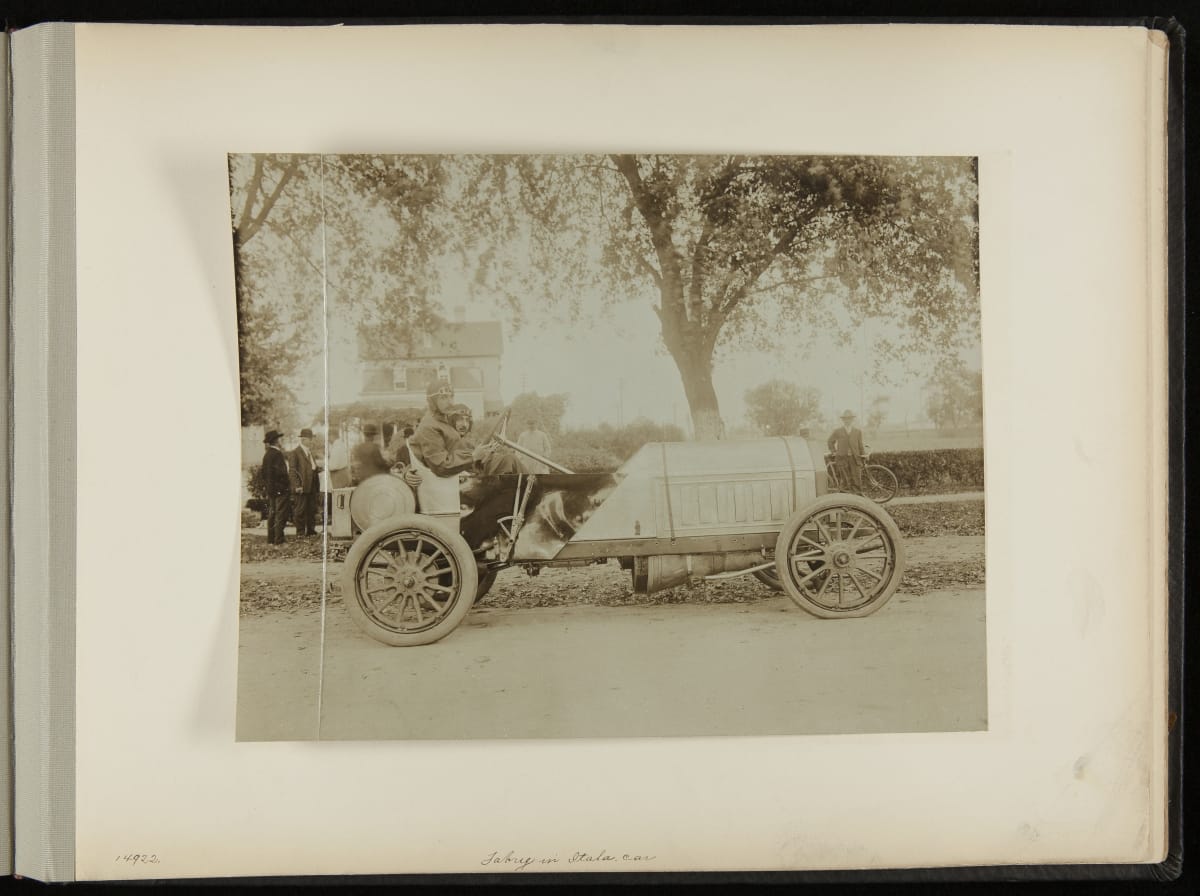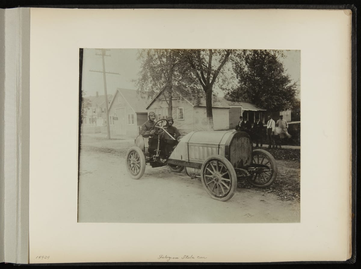 The Vanderbilt Cup, held on New York's Long Island from 1904 to 1910, was America's first internationally prominent automobile race. William K. Vanderbilt, Jr., a wealthy railroad heir, organized the competition over public roads. European cars dominated the event's first years. This photo album documents the 1906 race, won by French driver Louis Wagner in a French-built Darracq.