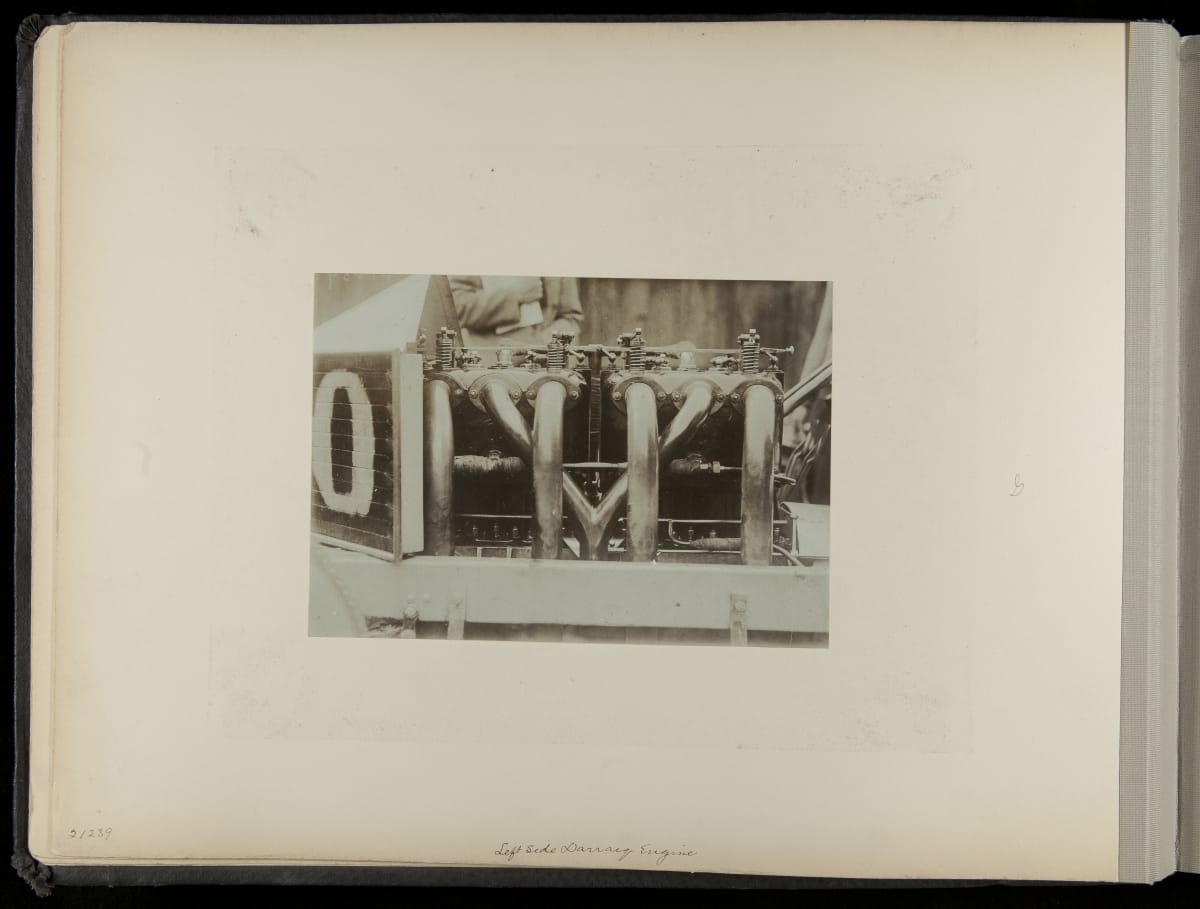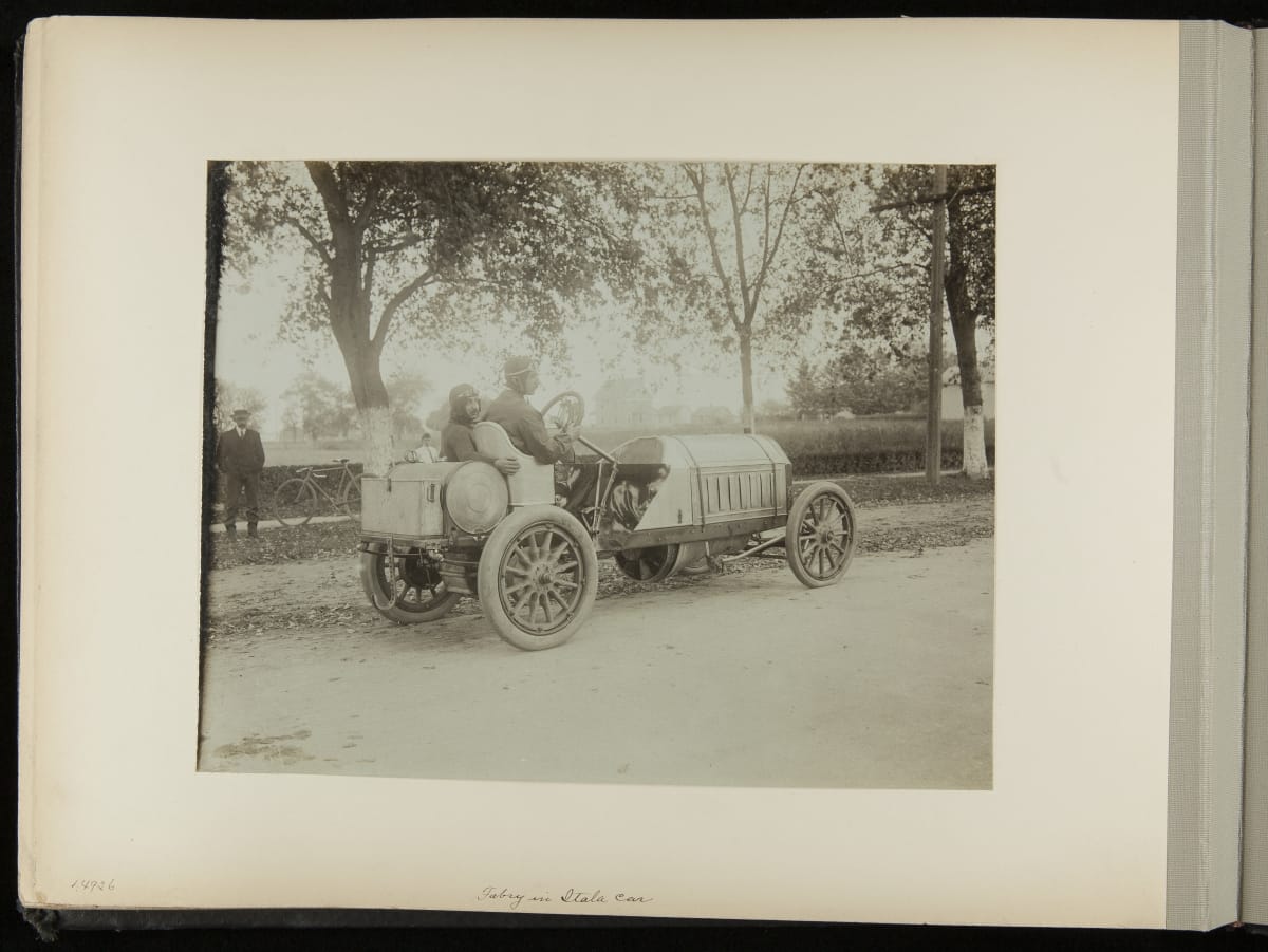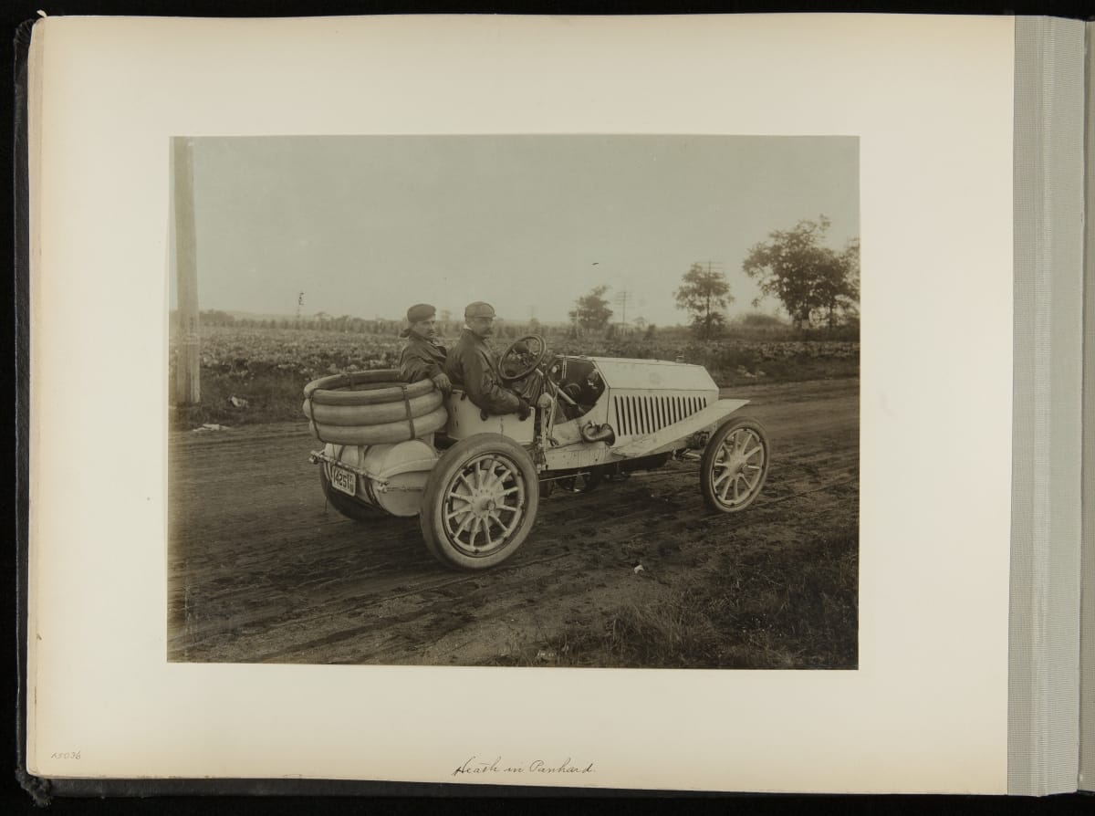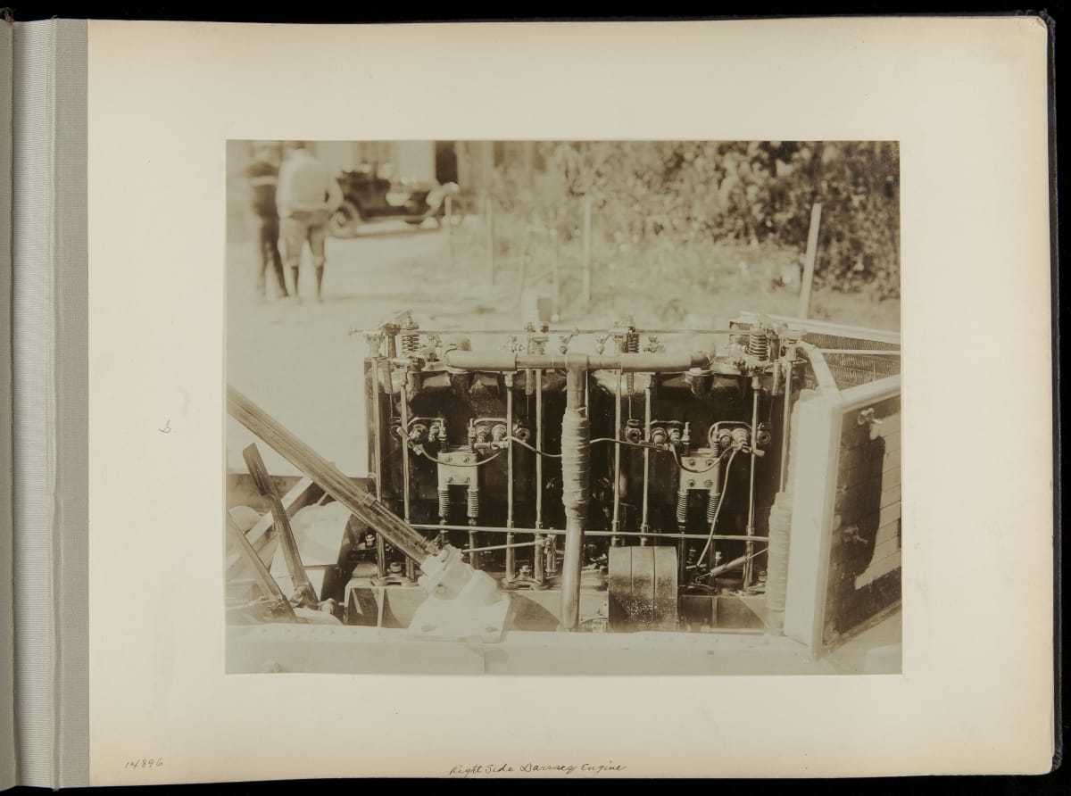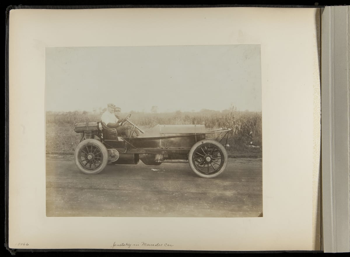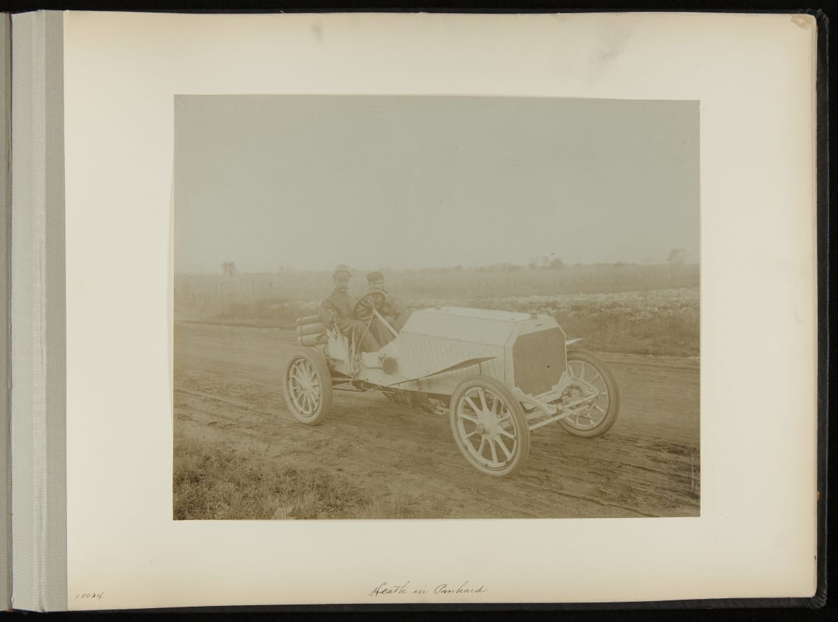 The Vanderbilt Cup, held on New York's Long Island from 1904 to 1910, was America's first internationally prominent automobile race. William K. Vanderbilt, Jr., a wealthy railroad heir, organized the competition over public roads. European cars dominated the event's first years. This photo album documents the 1906 race, won by French driver Louis Wagner in a French-built Darracq.