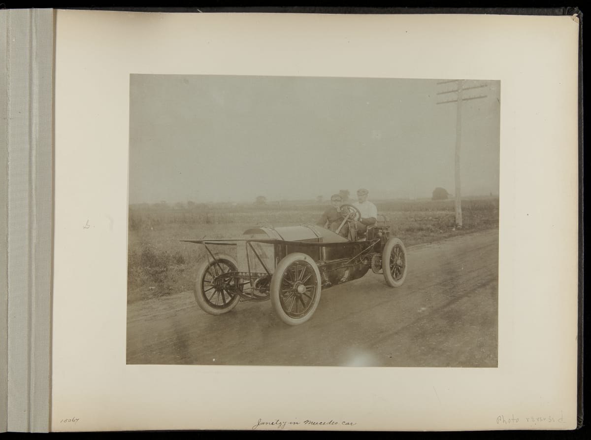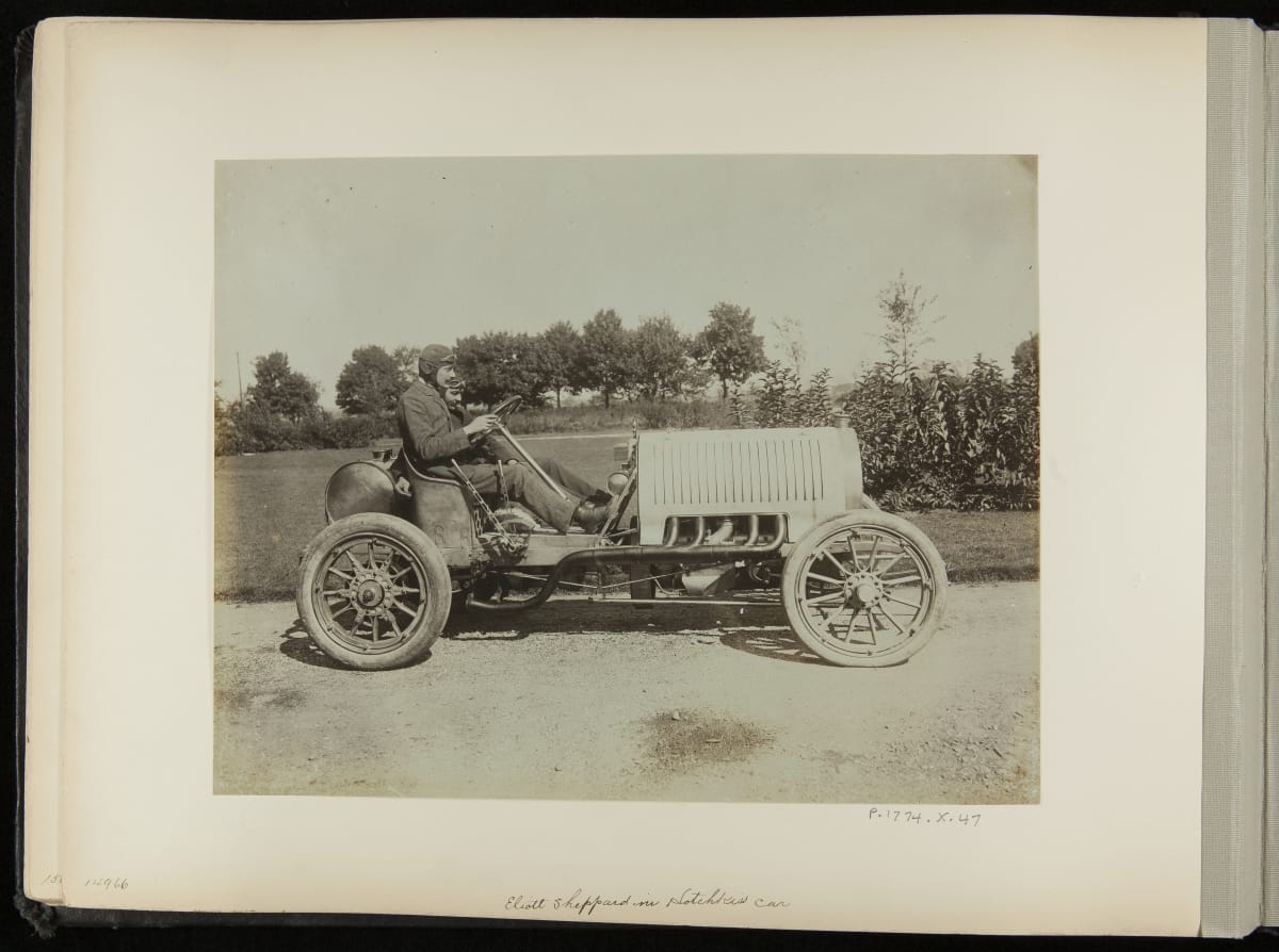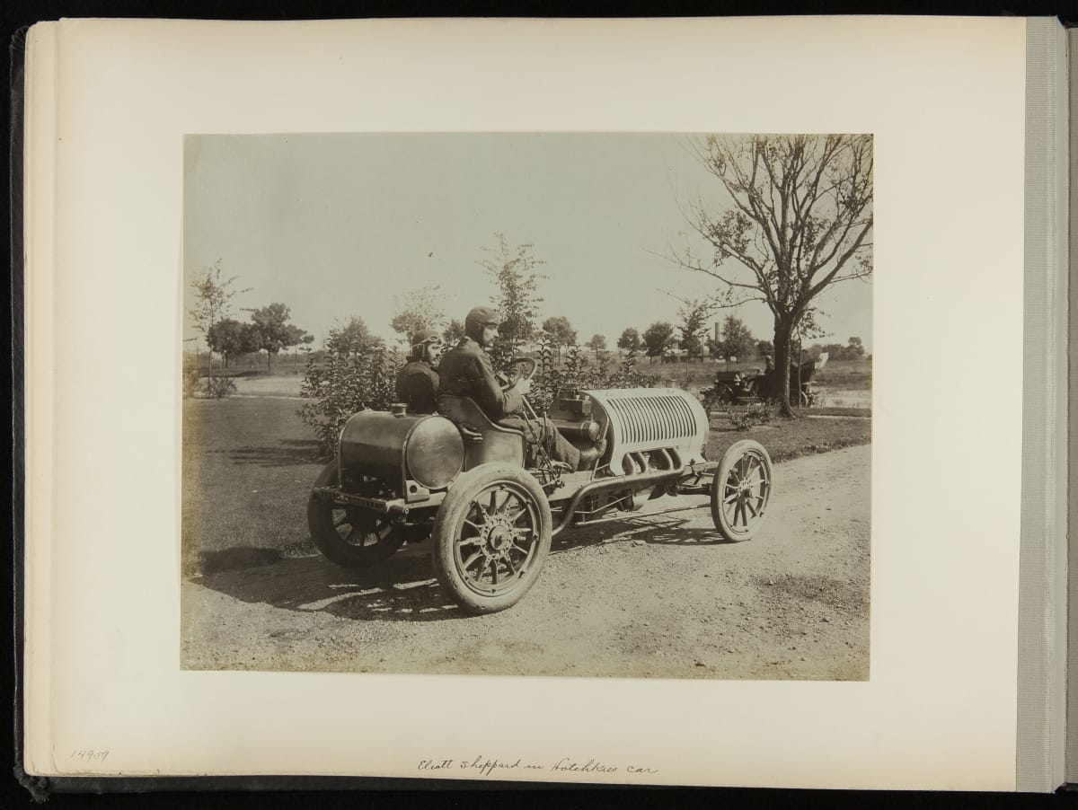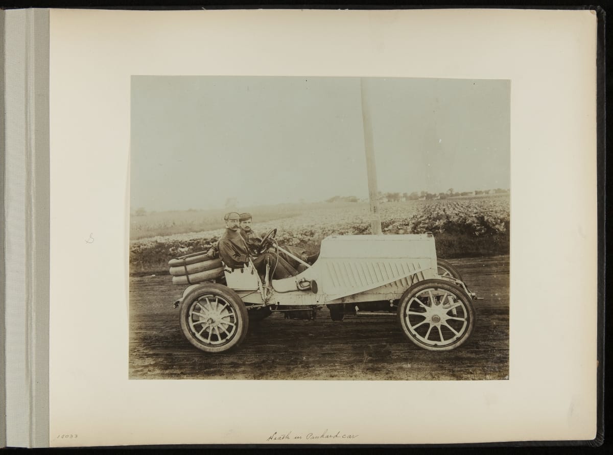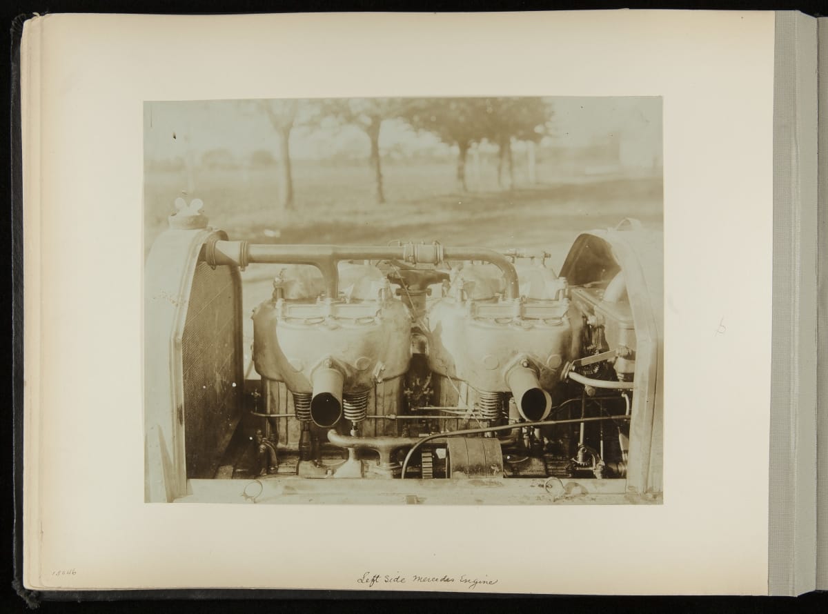The Vanderbilt Cup, held on New York's Long Island from 1904 to 1910, was America's first internationally prominent automobile race. William K. Vanderbilt, Jr., a wealthy railroad heir, organized the competition over public roads. European cars dominated the event's first years. This photo album documents the 1906 race, won by French driver Louis Wagner in a French-built Darracq.