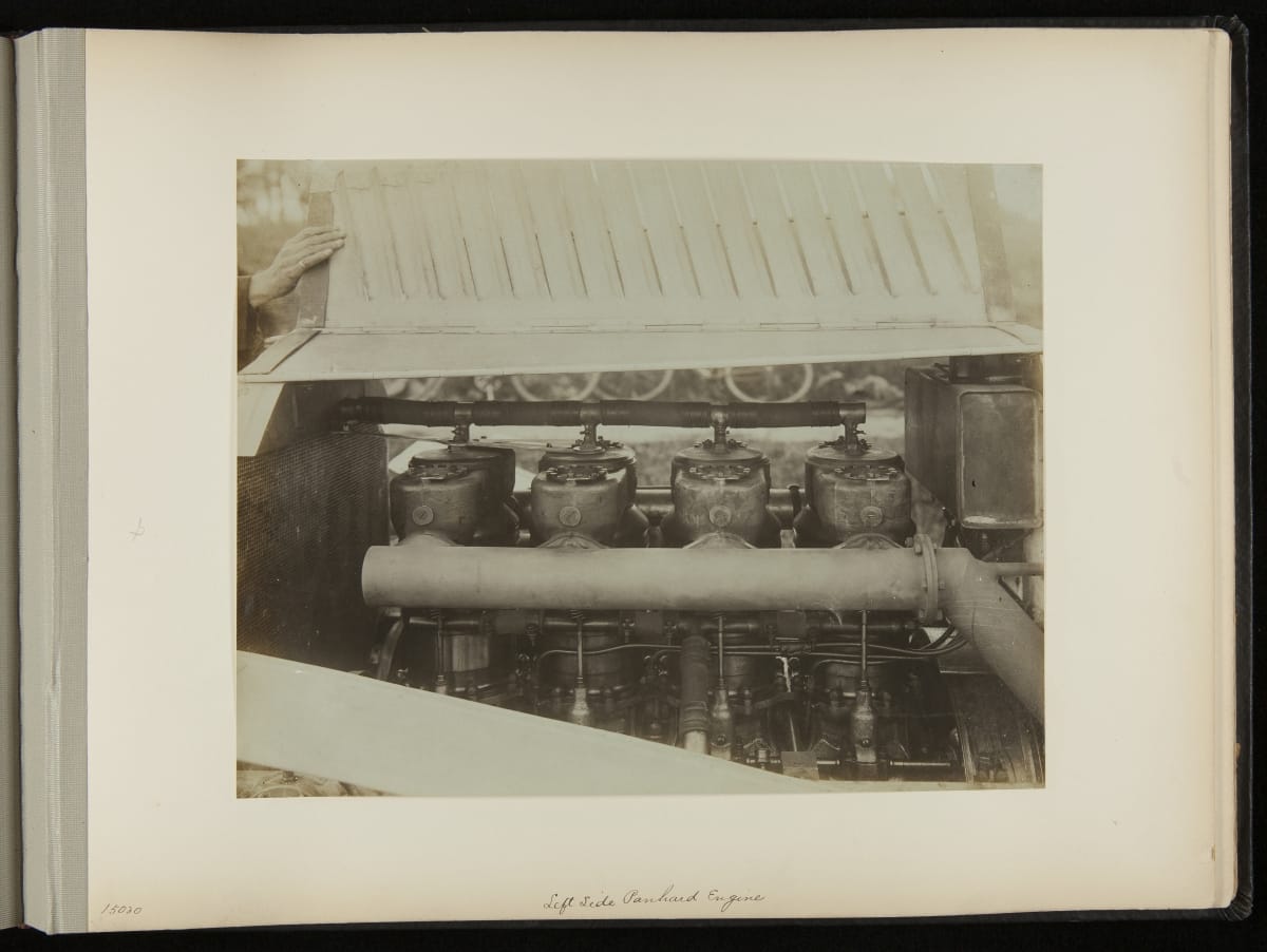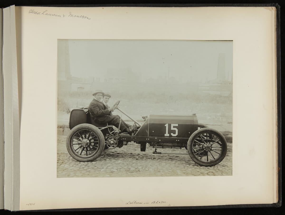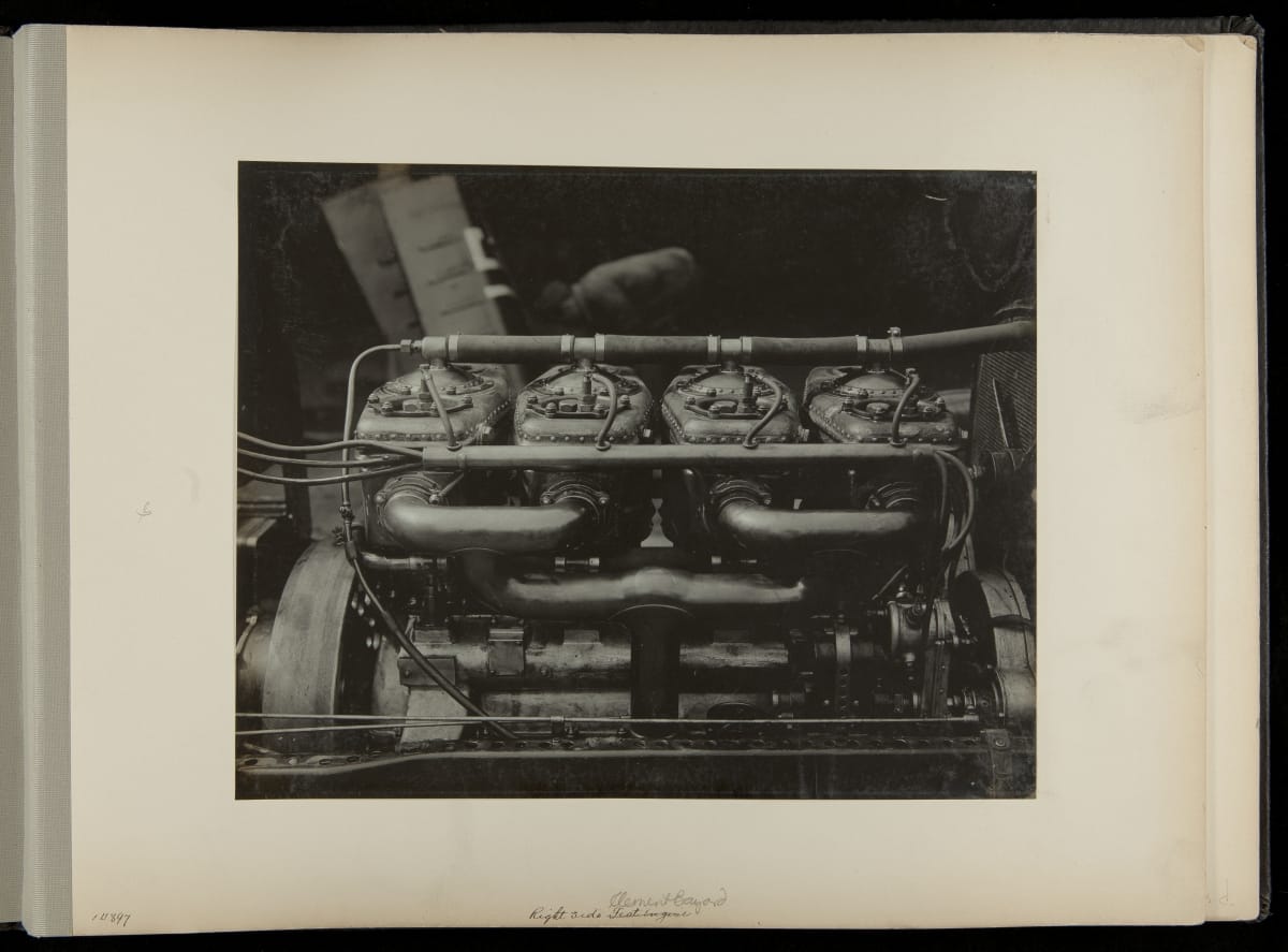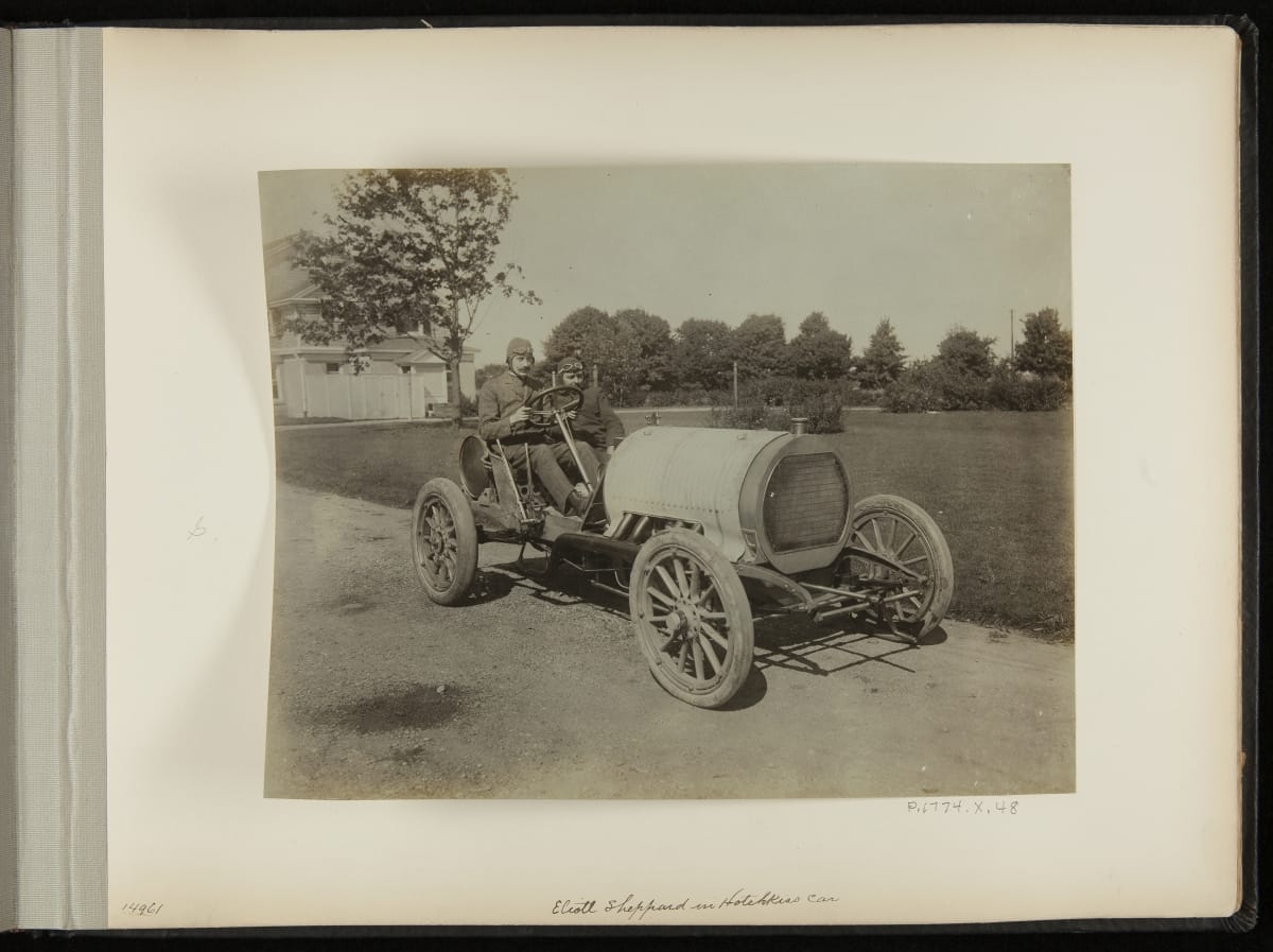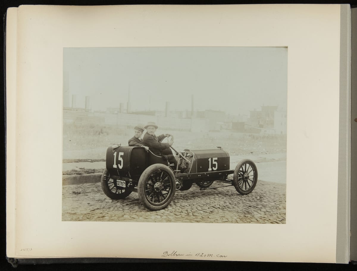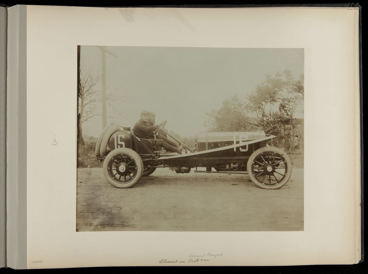 The Vanderbilt Cup, held on New York's Long Island from 1904 to 1910, was America's first internationally prominent automobile race. William K. Vanderbilt, Jr., a wealthy railroad heir, organized the competition over public roads. European cars dominated the event's first years. This photo album documents the 1906 race, won by French driver Louis Wagner in a French-built Darracq.