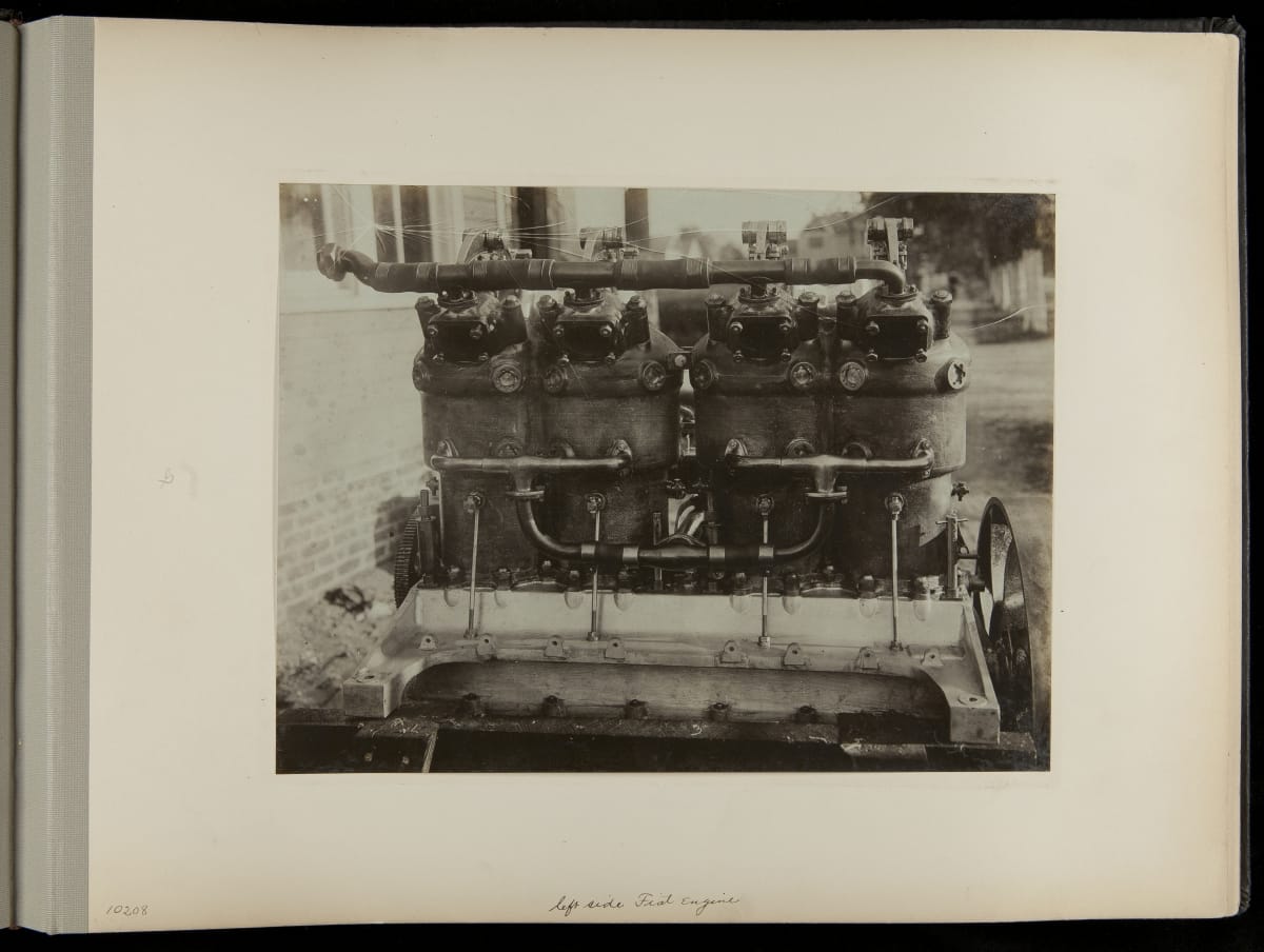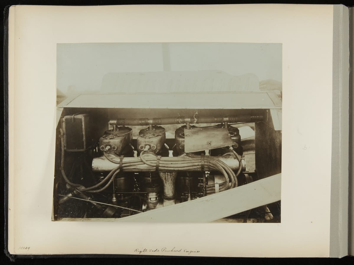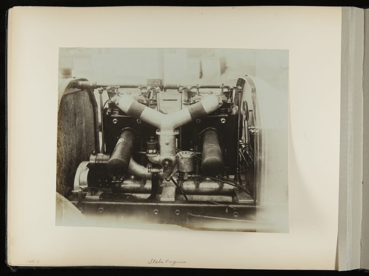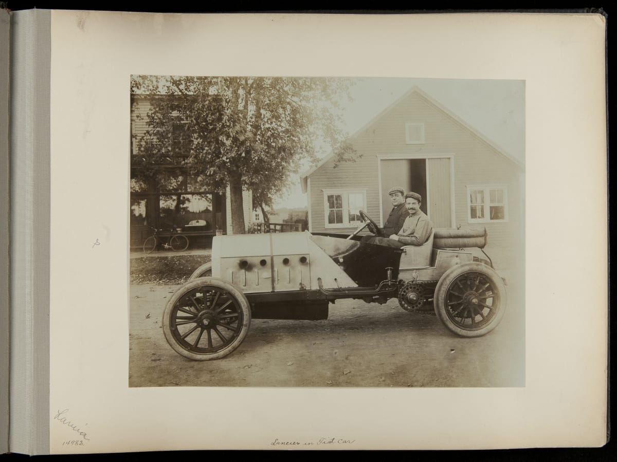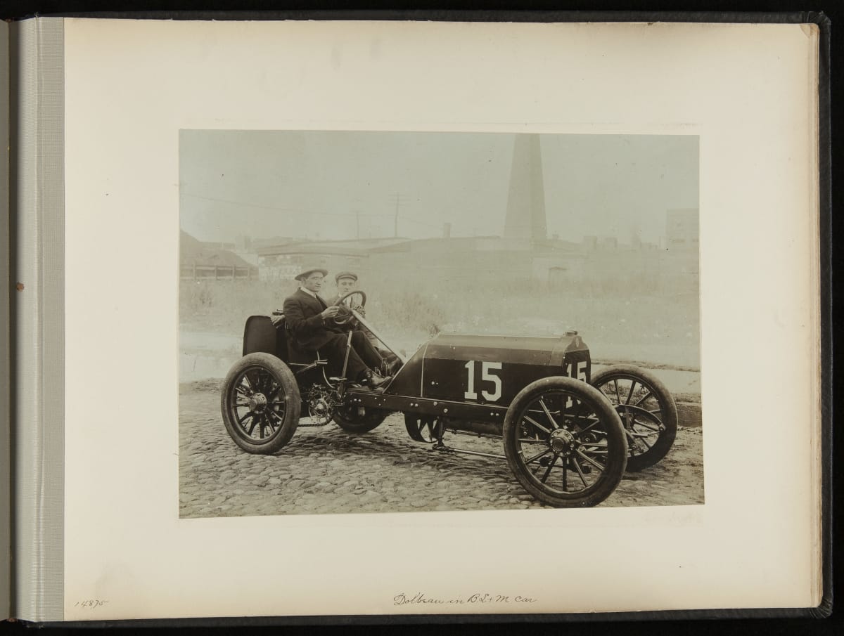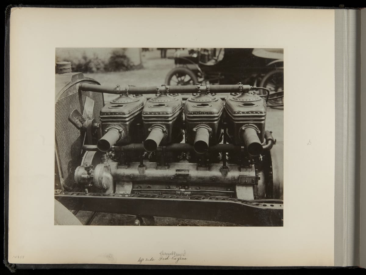 The Vanderbilt Cup, held on New York's Long Island from 1904 to 1910, was America's first internationally prominent automobile race. William K. Vanderbilt, Jr., a wealthy railroad heir, organized the competition over public roads. European cars dominated the event's first years. This photo album documents the 1906 race, won by French driver Louis Wagner in a French-built Darracq.