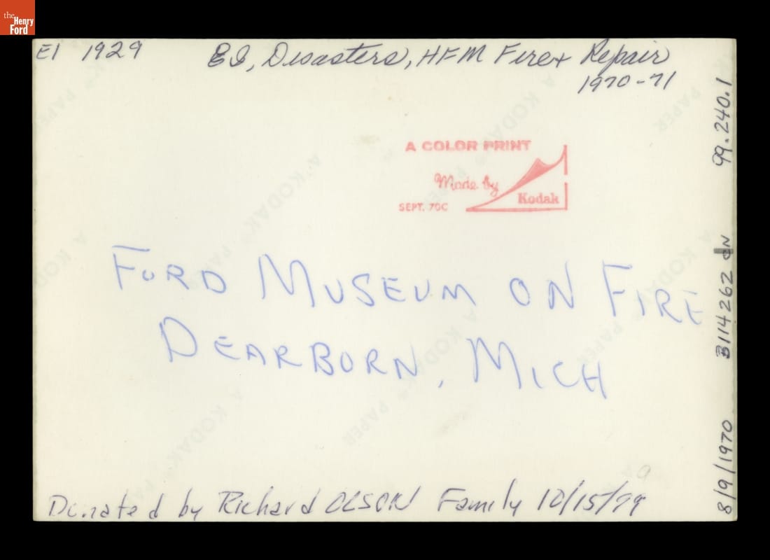 On August 9, 1970 a fire broke out in the Henry Ford Museum. Visitors who had been enjoying the exhibits calmly left the building. Firefighters quickly responded and fought the blaze. By the time the fire was under control several exhibits and hundreds of artifacts had been lost. Unaffected areas of the museum reopened two days later and complete repairs took over a year.