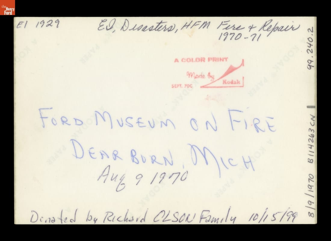 On August 9, 1970 a fire broke out in the Henry Ford Museum. Visitors who had been enjoying the exhibits calmly left the building. Firefighters quickly responded and fought the blaze. By the time the fire was under control several exhibits and hundreds of artifacts had been lost. Unaffected areas of the museum reopened two days later and complete repairs took over a year.