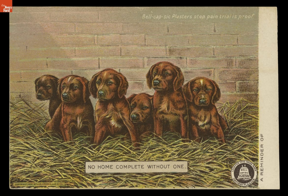 Inexpensive lithograph prints made in the mid-19th century emphasized people's relationship with dogs. Starting in the late 1890s picture postcards included these types of popular illustrations of dogs. Many companies used these images to advertise a variety of products, ranging from medicinal goods to automobiles.
