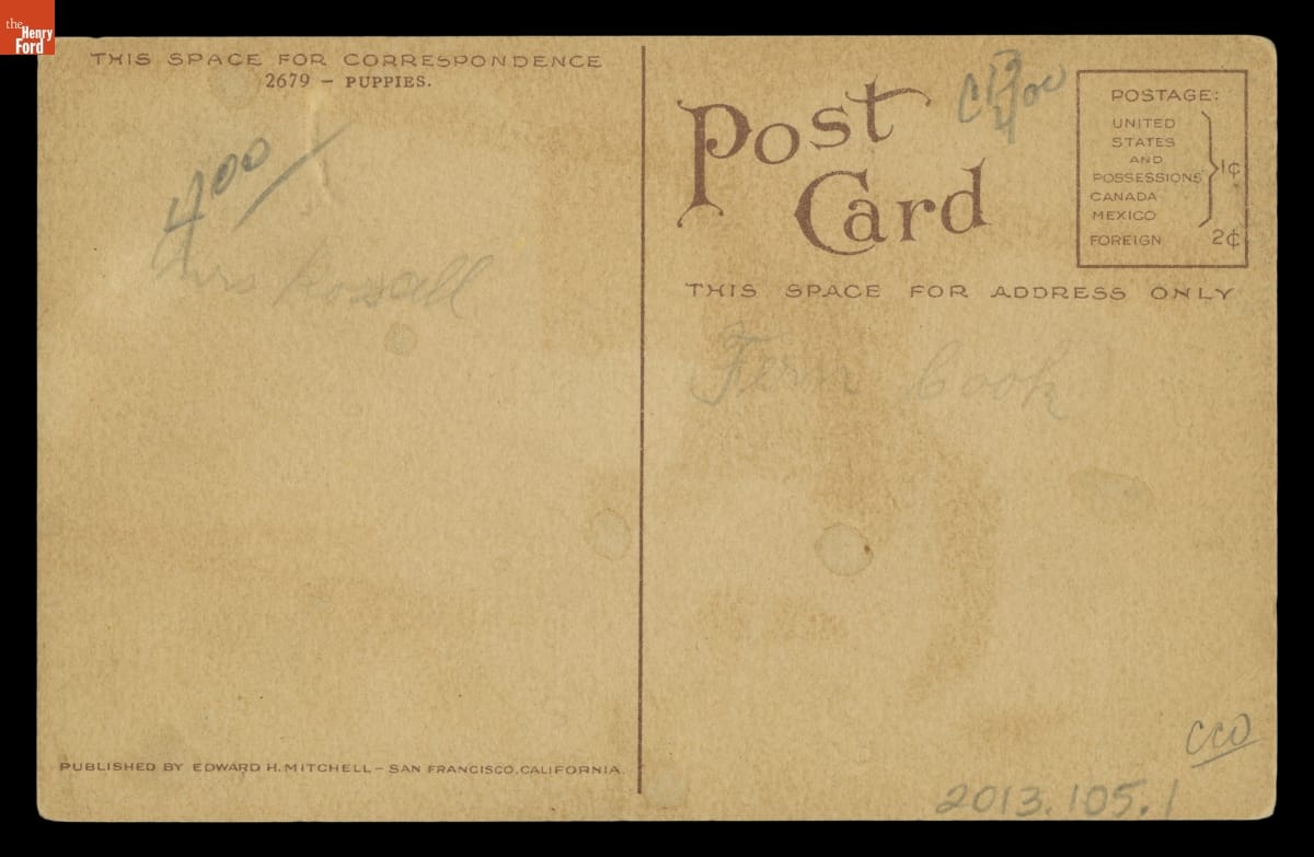 Depictions of dogs and puppies often appeared in art and folk art in the United States. Inexpensive lithograph prints made in the mid-19th century emphasized people's relationship with dogs. Starting in the late 1890s picture postcards included these types of popular illustrations of dogs. Sending colorful postcards through the U.S. mail continued to be widespread well into the 1910s.