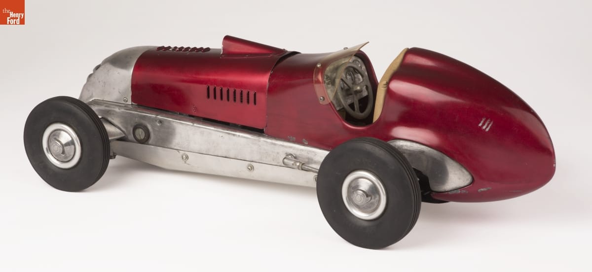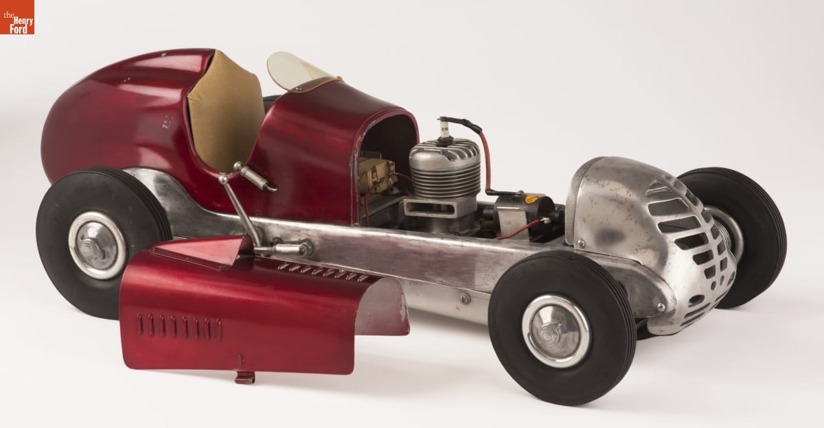 Tether cars, gas-powered model race cars, were popular in the 1930s and 1940s. They were raced individually while tethered to a central pivot, or against each other on a scaled-down board track. This magnesium-bodied model of an Indianapolis-style racer was built by Barney (B.B.) Korn. While Korn's models weren't particularly fast, they were exceptional in their fine detail and craftsmanship.