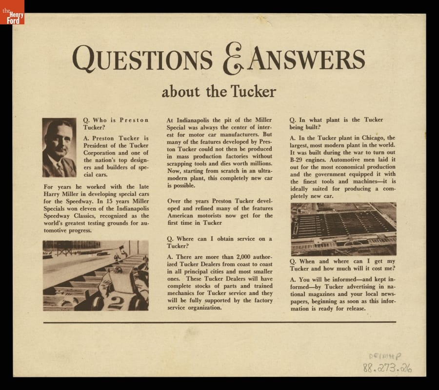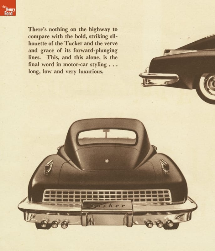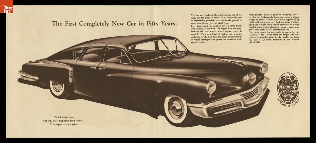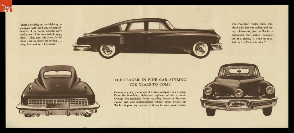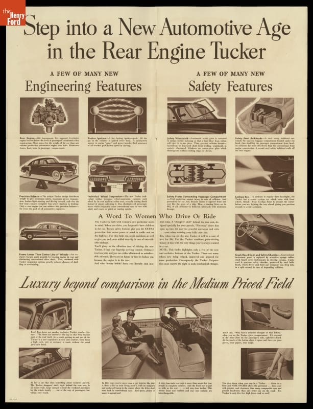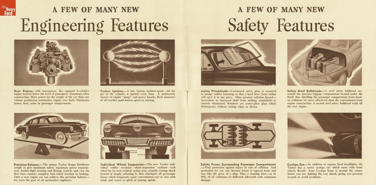 This sales brochure highlights the engineering, safety and styling features of the 1948 Tucker. Some of the Tucker's features, like moving headlights, are found on some high-end cars today.