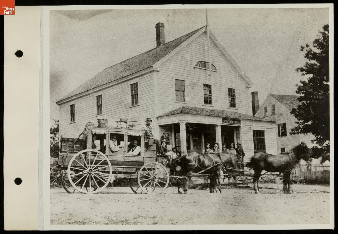 This hack passenger wagon, with its smaller, square body and open sides, was a less expensive type of public coach. Used for short distance travel in rural areas, these vehicles carried passengers between towns and villages. Quite appropriately, this driver has posed his vehicle in front of a post office -- stage lines also transported the U.S. mail along their routes.