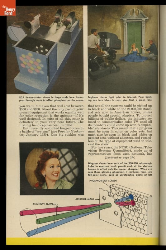 The centerpiece article in this issue of Popular Mechanics introduced readers to the technical world of color television. The Tournament of Roses parade, January 1, 1954, was the subject of NBC's first national color broadcast. Early cameras were adjusted and aligned with a color wheel on sets. Costumes and backgrounds highlighted the medium's ability to capture a rainbow of hues.