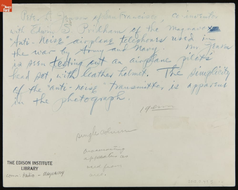 Peter L. Jensen of San Francisco, co-inventor with Edwin S. Pridham of the Magnavox "Anti-Noise" airplane telephones used in the war by Army and Navy. Mr. Jensen is seen testing out an airplane pilot's head set, with leather helmet. The simplicity of the "anti-noise" transmitter is apparent in the photograph.